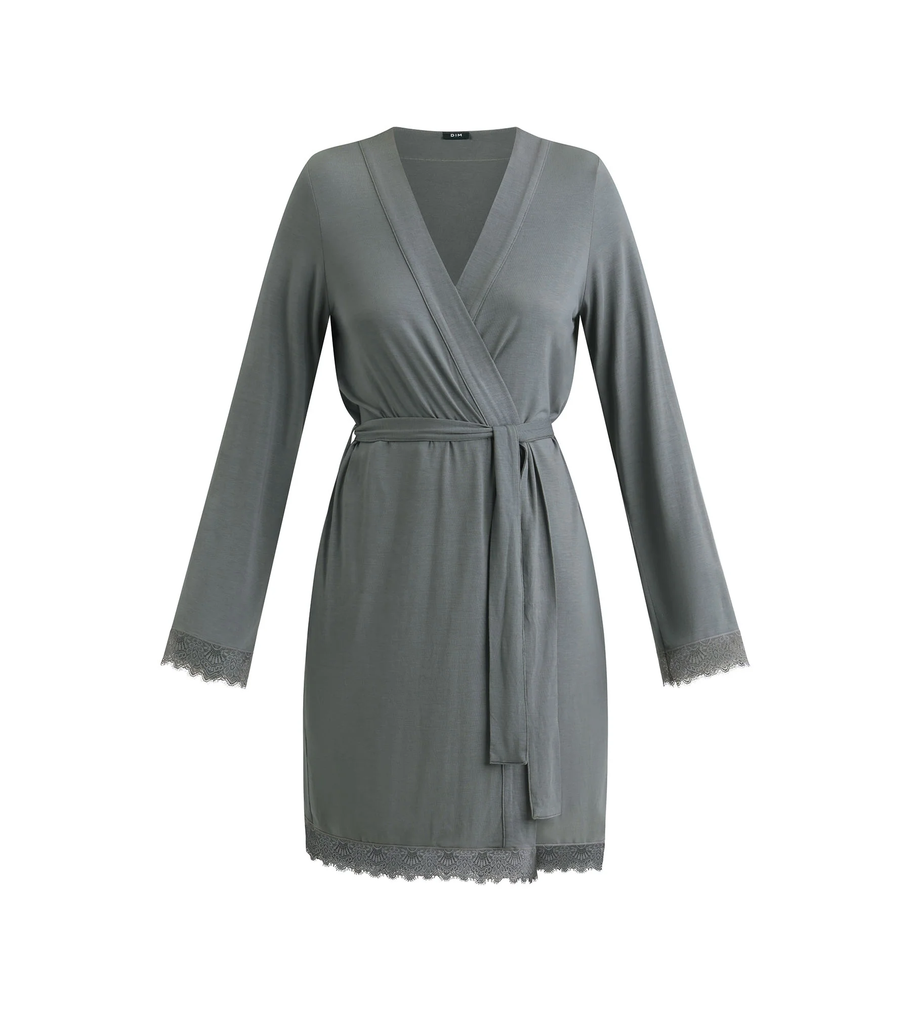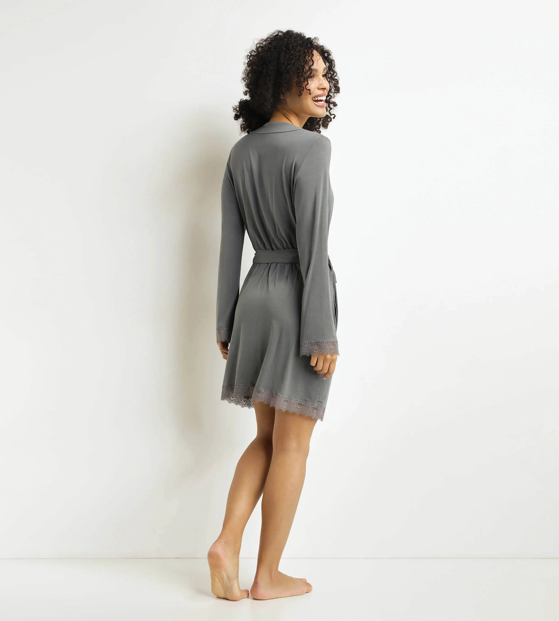 Adopta un look acogedor y chic de día o de noche con el albornoz para mujer Dim Don’t Disturb de algodón gris y encaje.