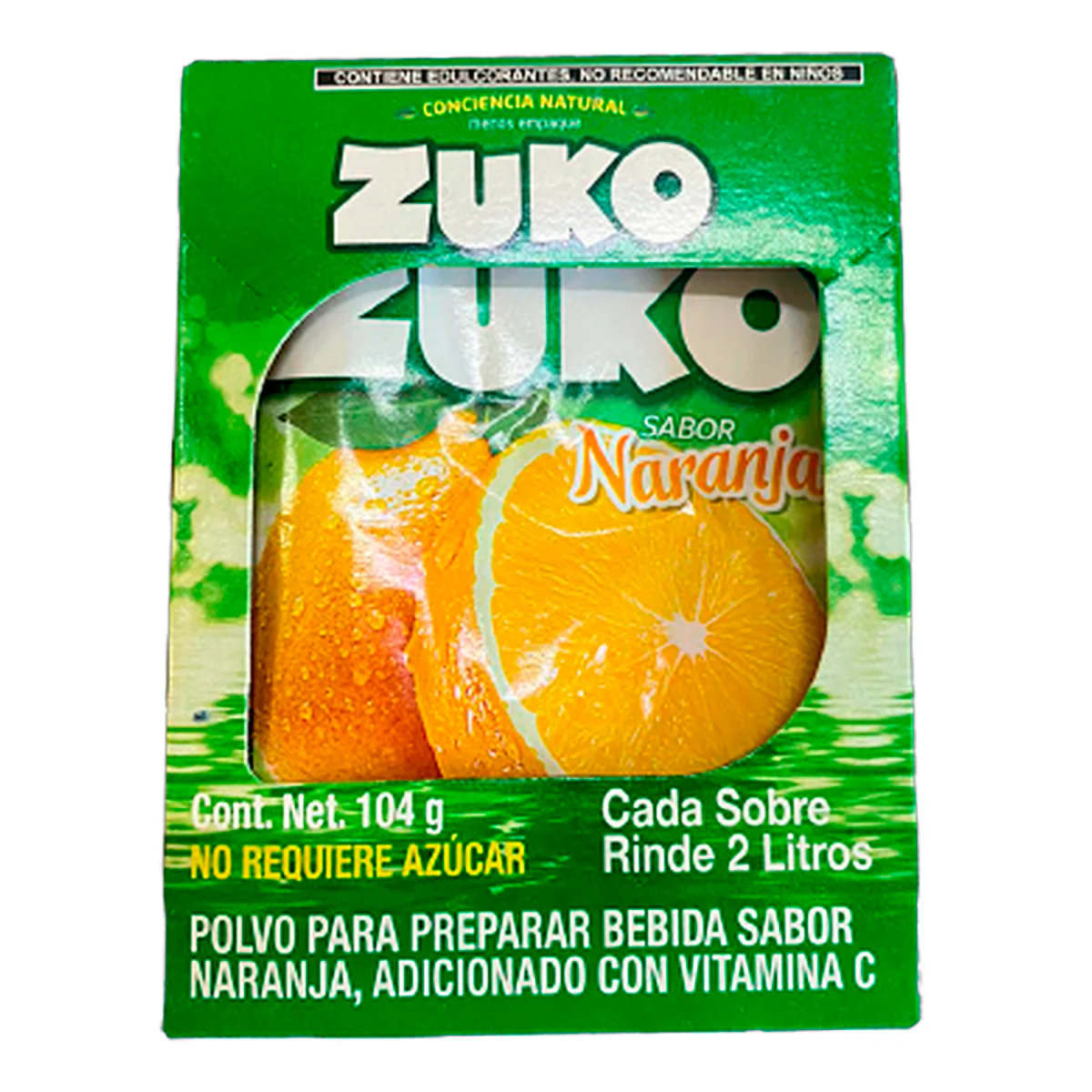 Concentrados Para Agua Zuko Naranja, De Un Exhibidor De 8 Sobres De 13 Gramos. Nada Sabe Como Zuko, Zuko Es La Bebida Instantánea Que Te Ayuda En Todo Momento A Dar Sabor Y Variedad A Tu Familia. Acompaña Tus Comidas Con El Increíble Sabor, Que Además Está Adicionado Con Vitamina C. Cada Sobre Rinde 2 Litros.