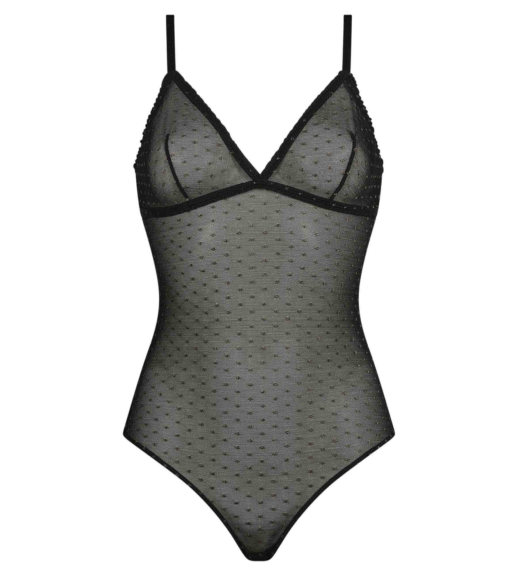 Confeccionado en tejido de tul con un sujetador triangular integrado sin aros, el body de tul transparente negro con lunares de lúrex Shiny Mesh de Dim envuelve tu cuerpo con suavidad y lo moldea de manera natural.
