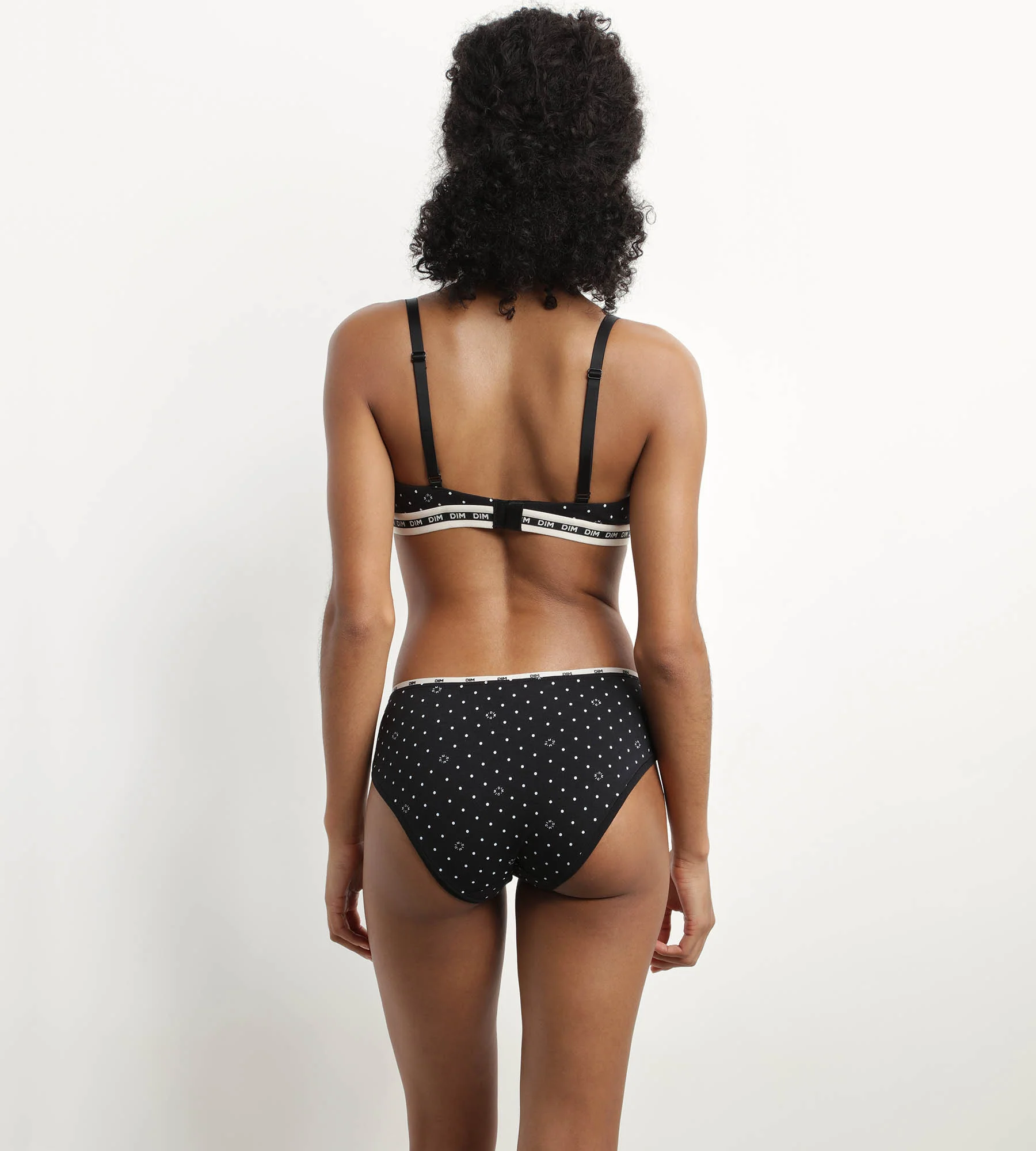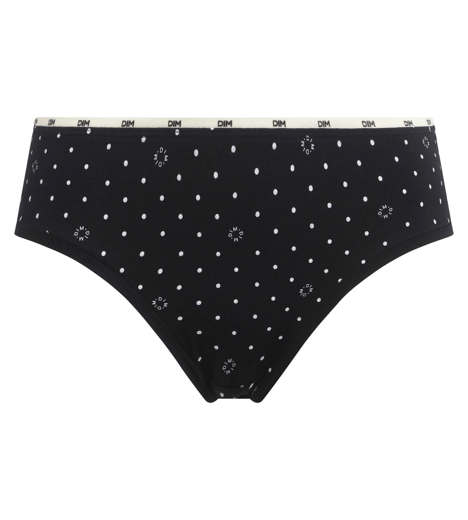 Los lunares y el logo de Dim estampados en esta braga negra le confieren un aspecto único y diferente a otros modelos más sencillos. Si quieres una ropa interior para el día a día con un toque especial, no te la pierdas.