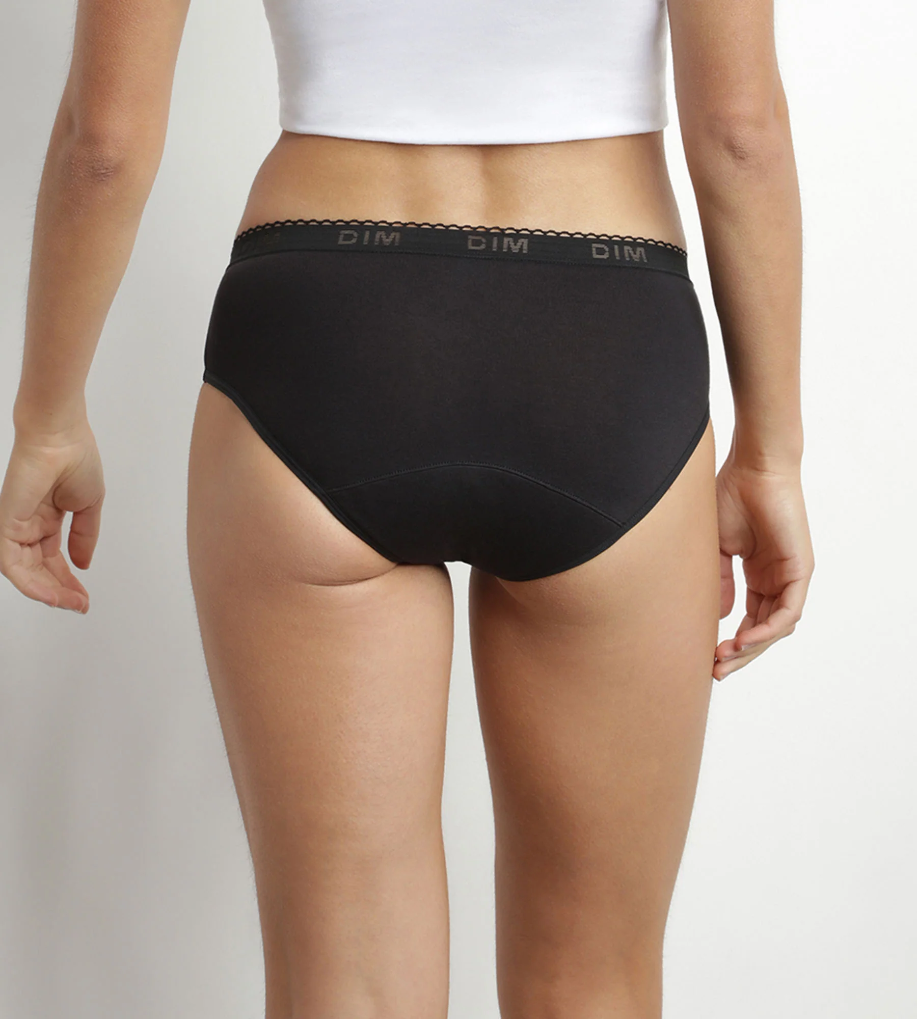 Tranquilidad garantizada desde los primeros ciclos con la braguita «Mi 1ª regla» de algodón orgánico acanalado negro Dim My Protect para flujos muy abundantes.