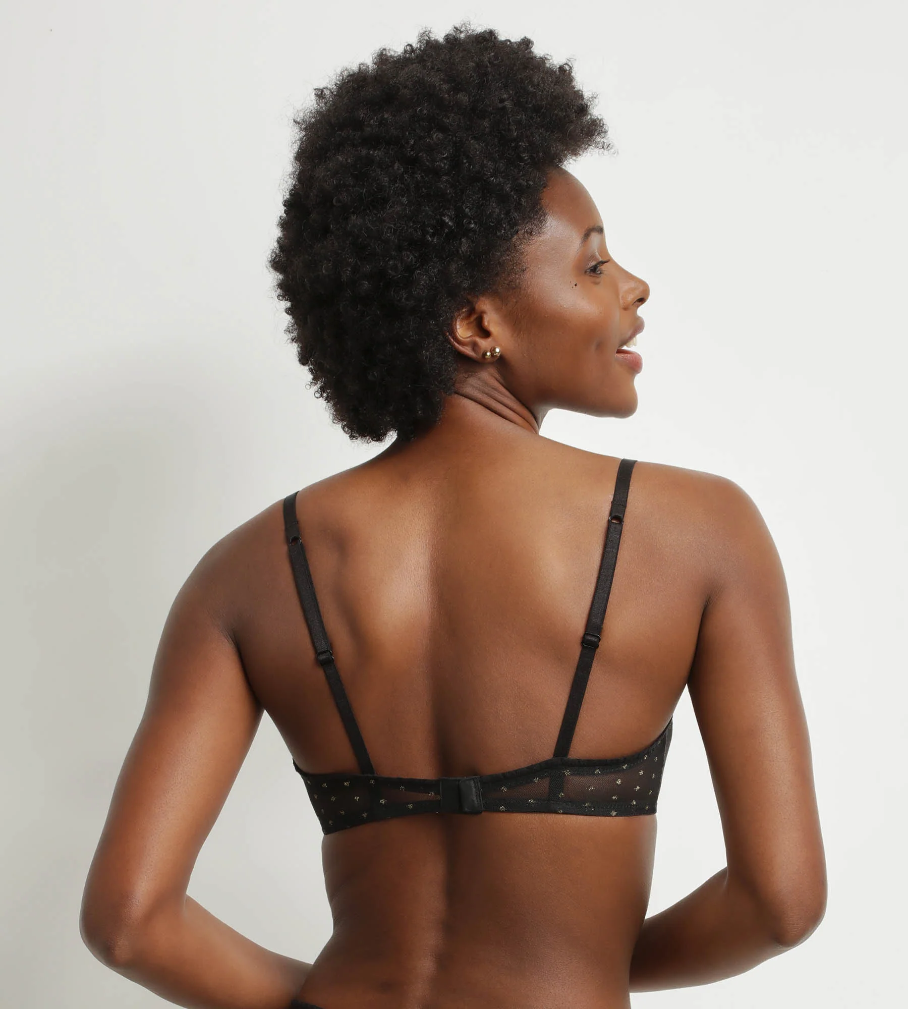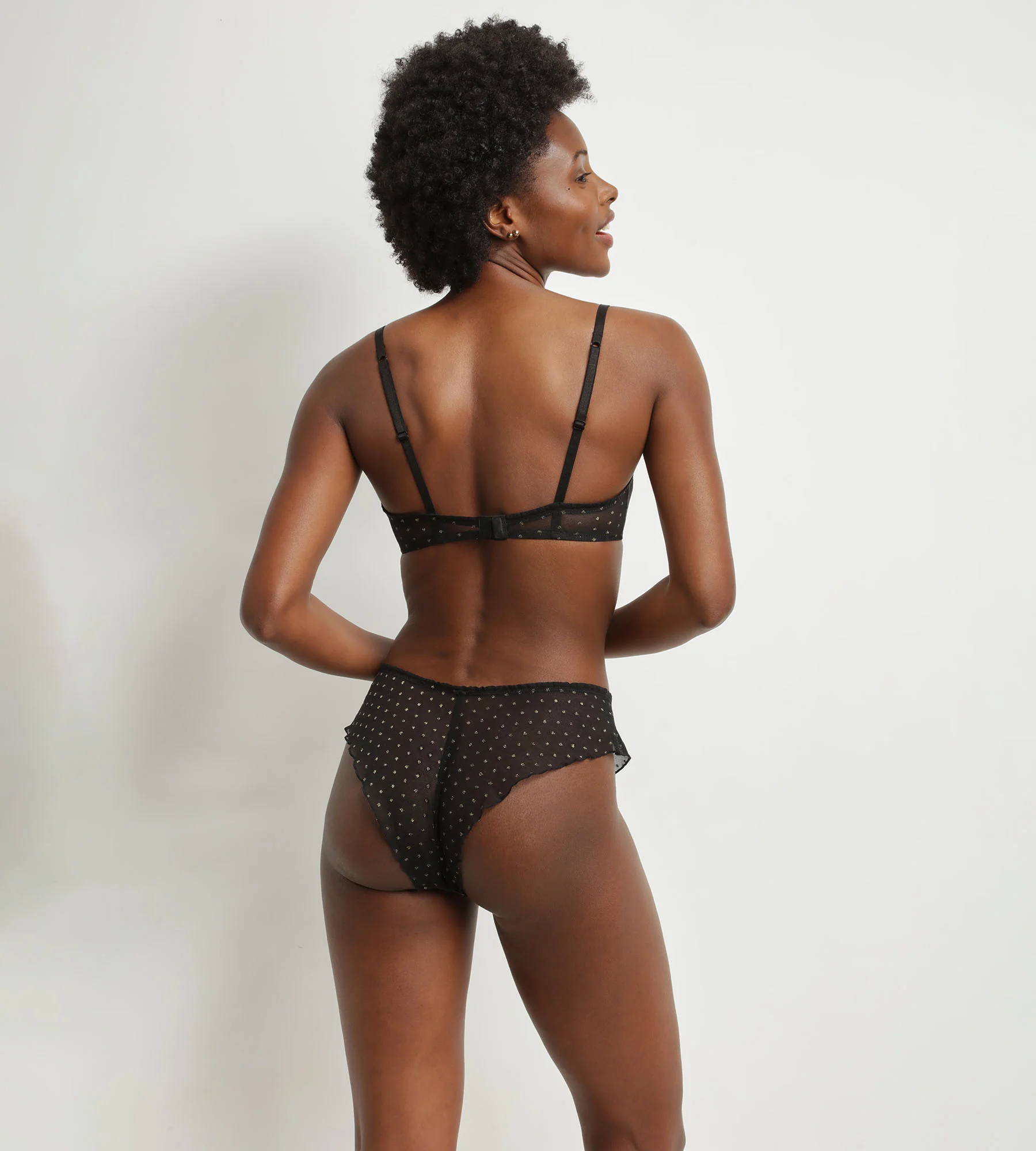 ¡Libérate de toda molestia con nuestro bralette de tul transparente negro con estampado de lunares Shiny Mesh de Dim!