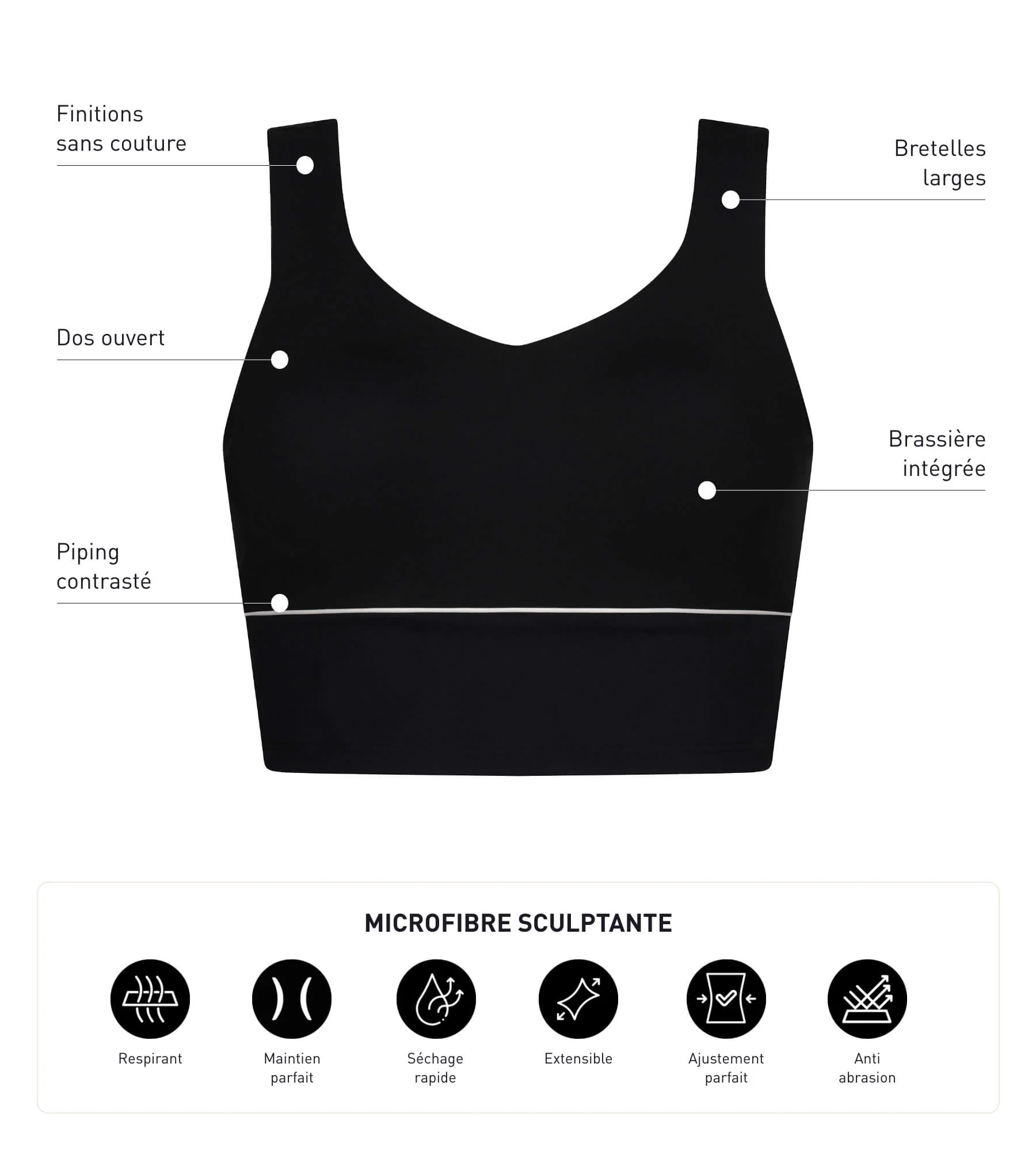 Con este magnífico corte bralette, sin costuras y acabados planos, tu pecho estará sujeto y tú te sentirás liberada y cómoda para hacer tu deporte favorito. Además, la microfibra moldeadora se adapta a cada cuerpo y transpira fenomenal gracias a un tejido que no irrita la piel.