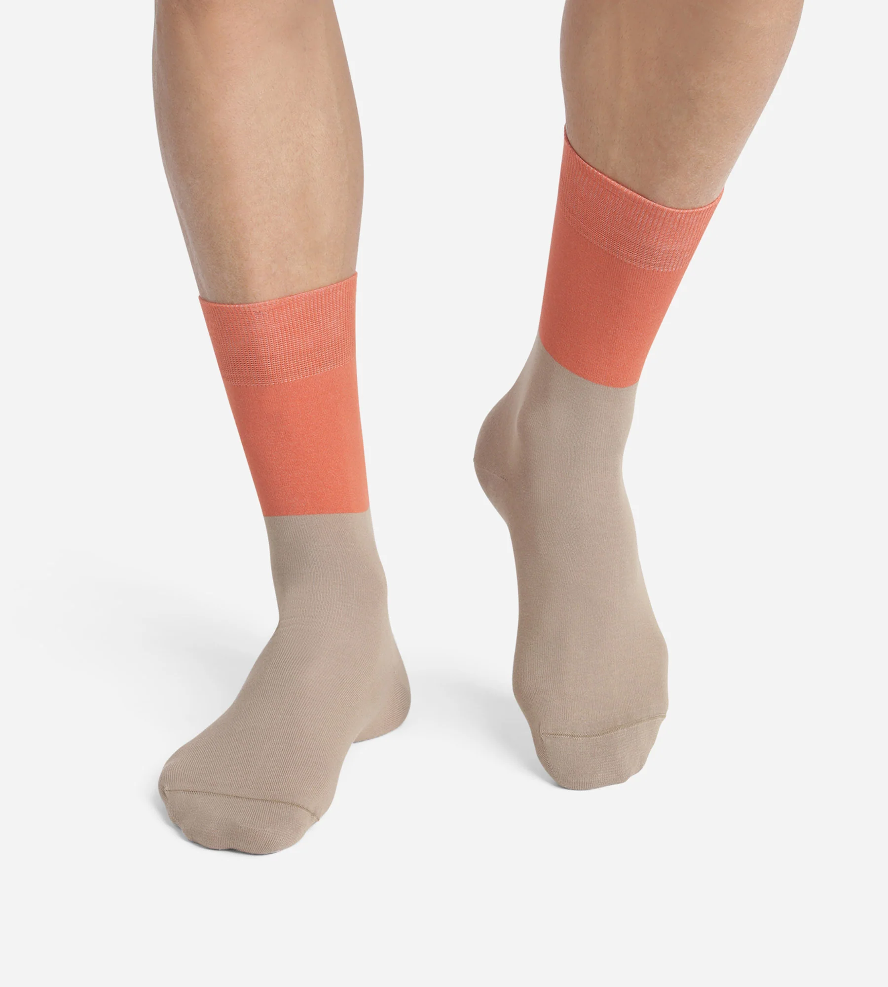 Demuestra tu estilo con los calcetines de algodón para hombre de Dim Mode en un diseño de bloques de color praliné y mandarina.