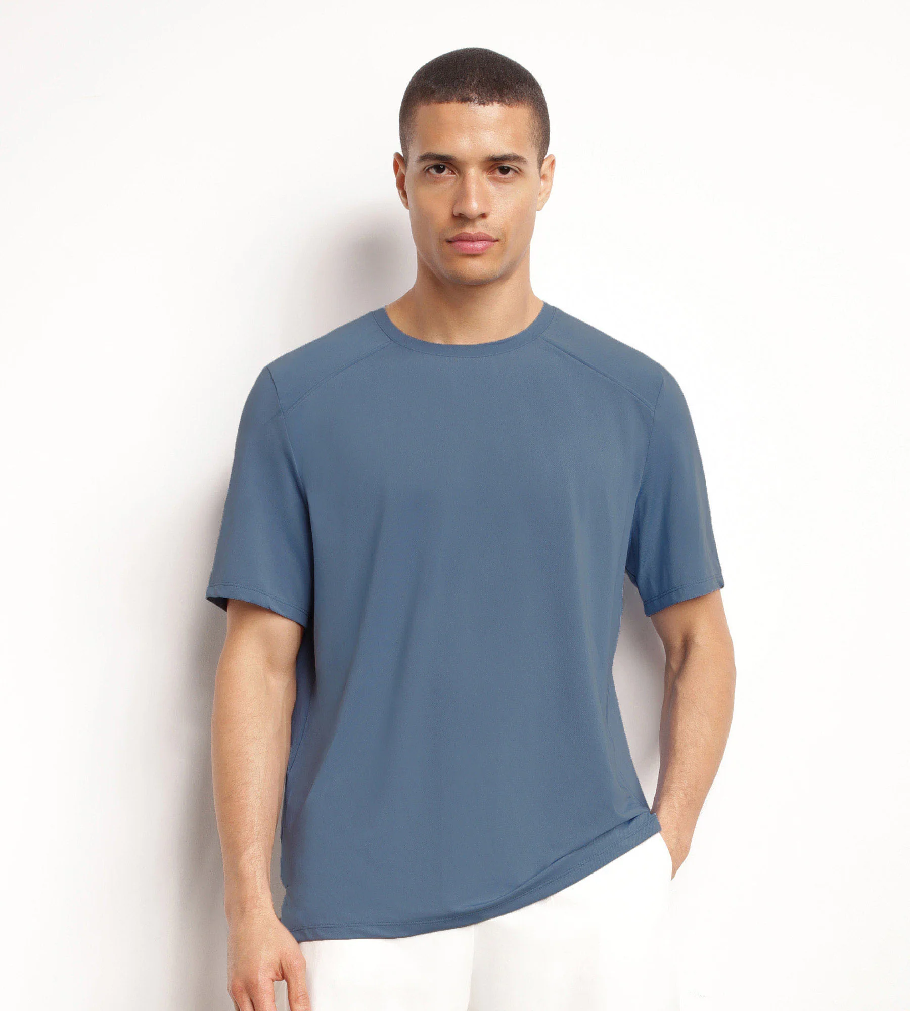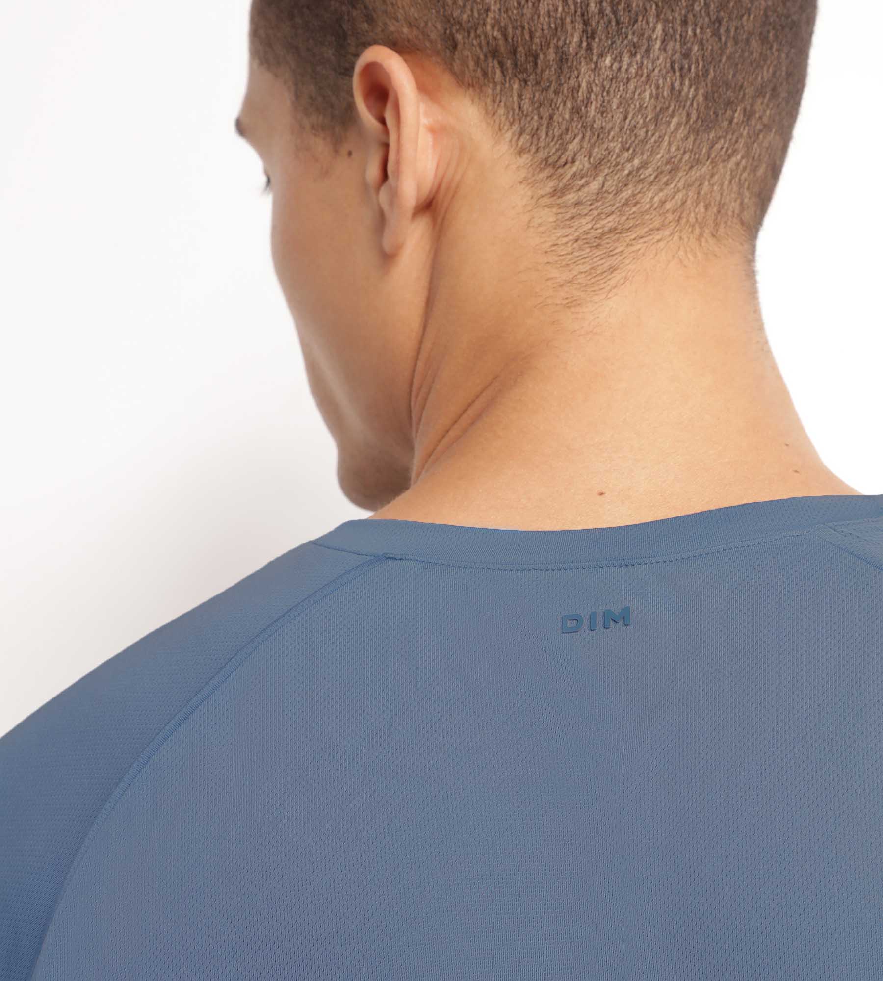 Tu experiencia haciendo fitness o un deporte se verá mejorada gracias a la máxima transpirabilidad de nuestra camiseta deportiva de hombre en tejido técnico azul Dim Move.