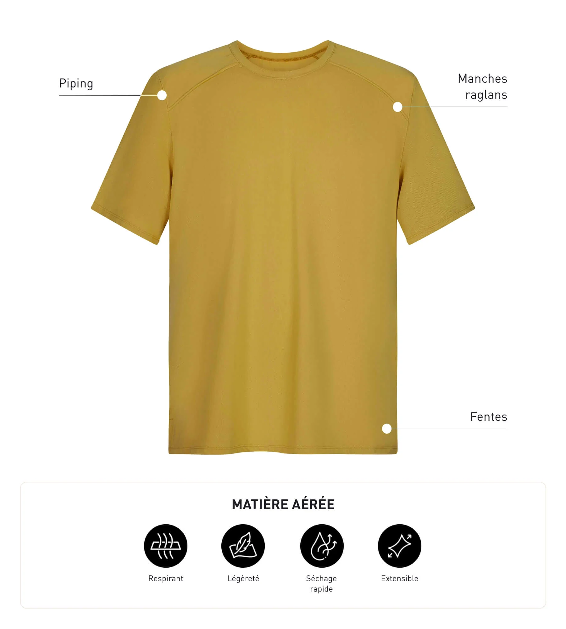 Tiene muchas ventajas: por un lado, su tejido es ligero, ajusta sin comprimir y se seca en un tris. Además, lleva aberturas laterales para mayor libertad de movimientos. Tienes esta camiseta de manga corta en otros colores: negra, azul y roja. Combínala con unos shorts del mismo o distinto color, según tus gustos.