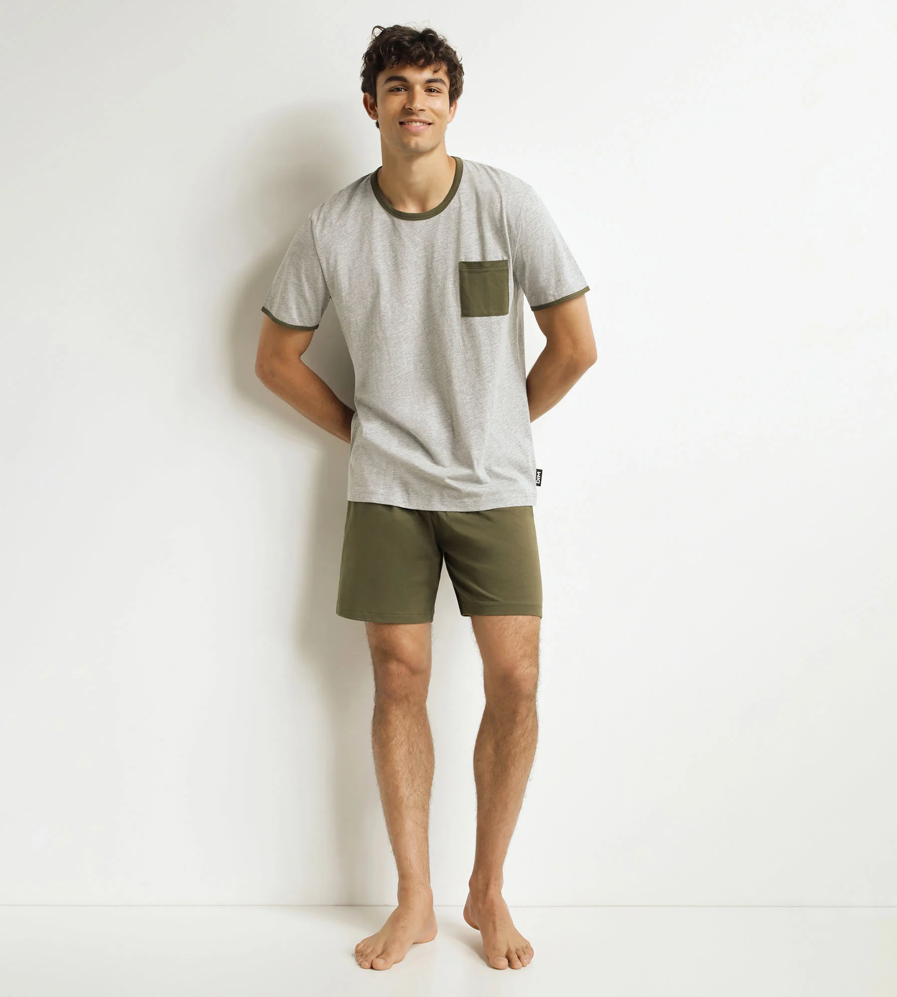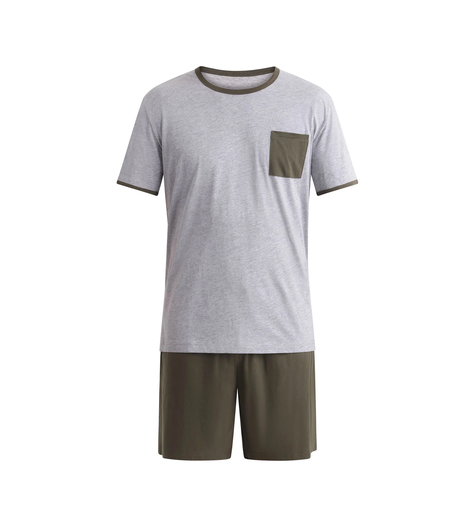 Descubre el conjunto de pantalón corto de pijama para hombre Dim Jersey en gris jaspeado y caqui, ligero y atemporal, ¡para llevarlo de día o de noche!