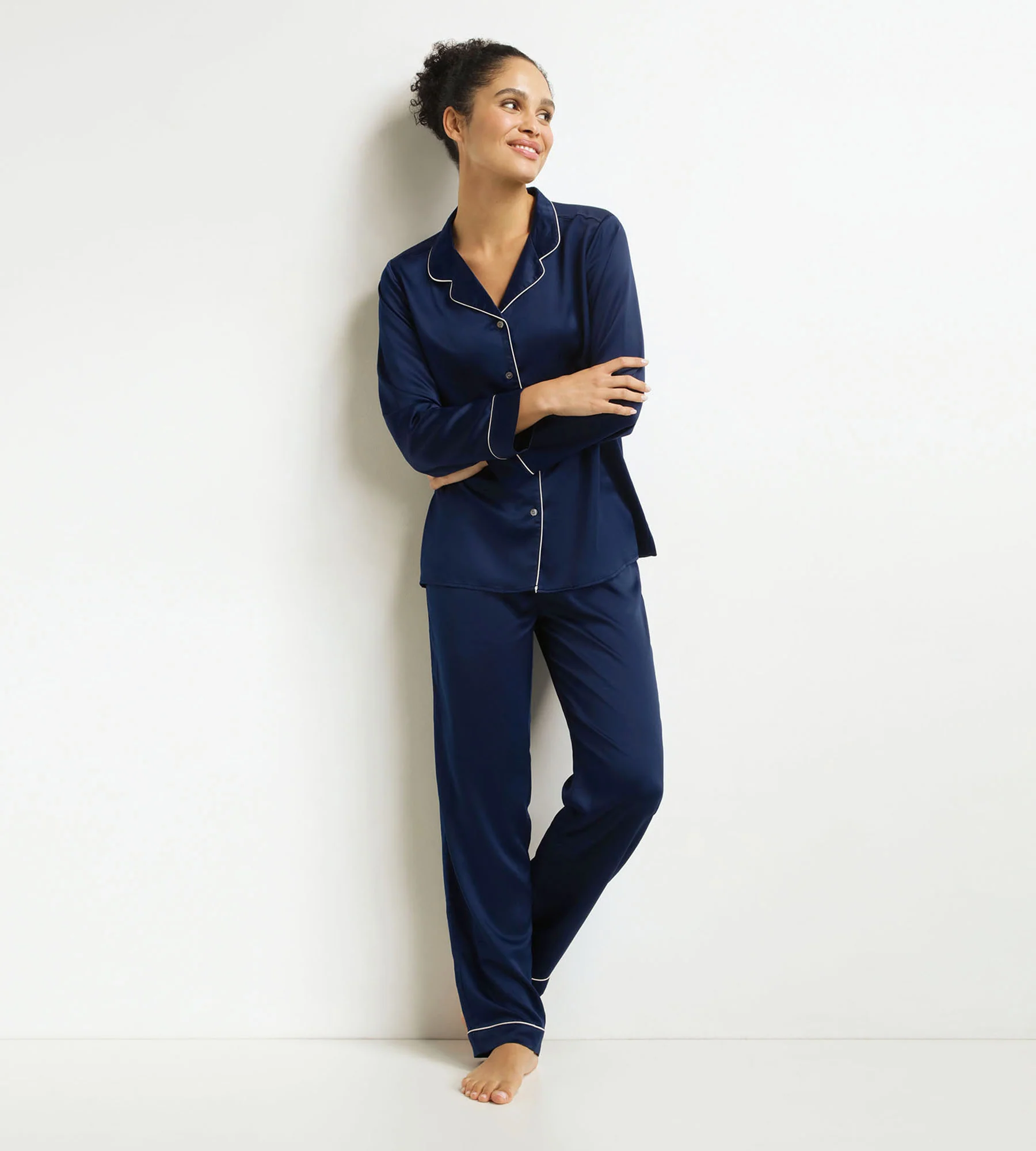 Compuesto por una camisa y un pantalón, este conjunto de pijama para mujer Dim Don’t Disturb acompaña tus noches con comodidad y elegancia. Confeccionados en jersey, son a la vez suaves y transpirables, para un bienestar total. Con su corte clásico y sus detalles en contraste, este conjunto de camisa y pantalón azul medianoche tiene un aire casual-chic que puede llevarse tanto de noche como de día.