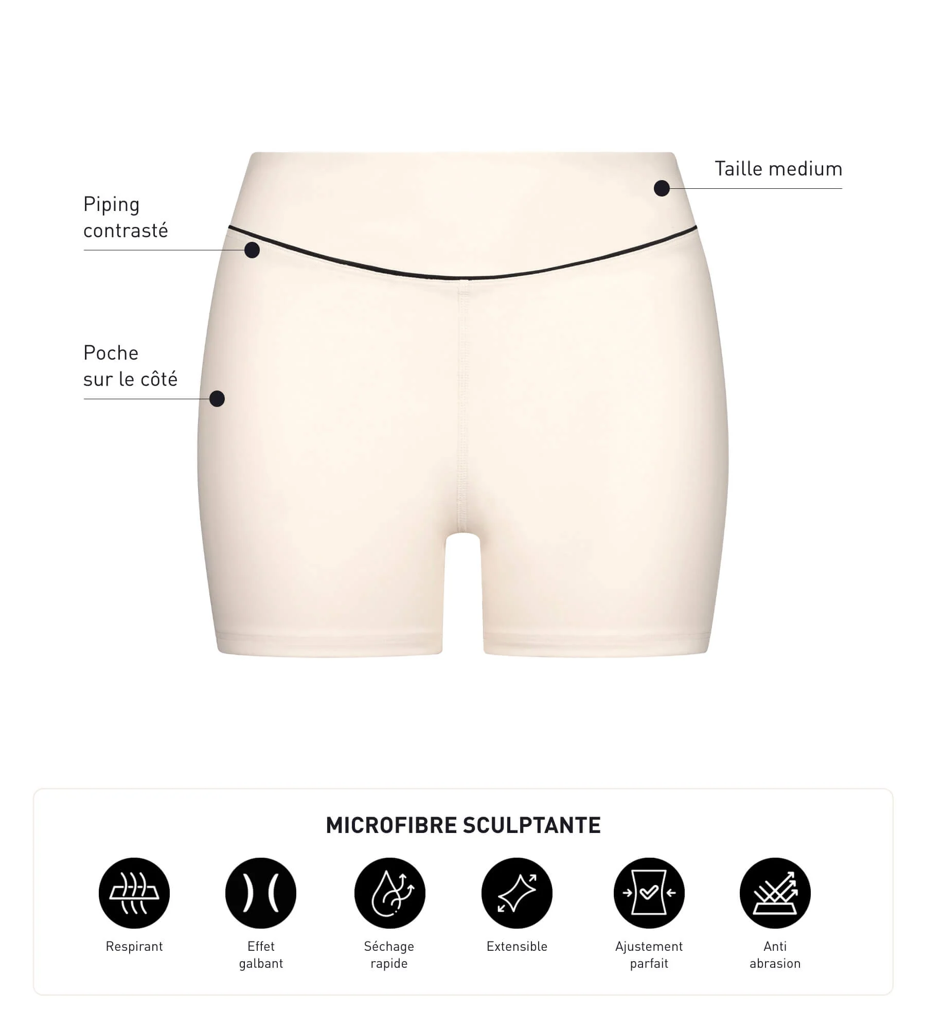 Hecho en microfibra elástica, moldeadora y transpirable, este culotte deportivo de mujer en color crudo pertenece a la gama de ropa deportiva Dim Move que pretende acompañarte con diseños modernos muy cómodos.