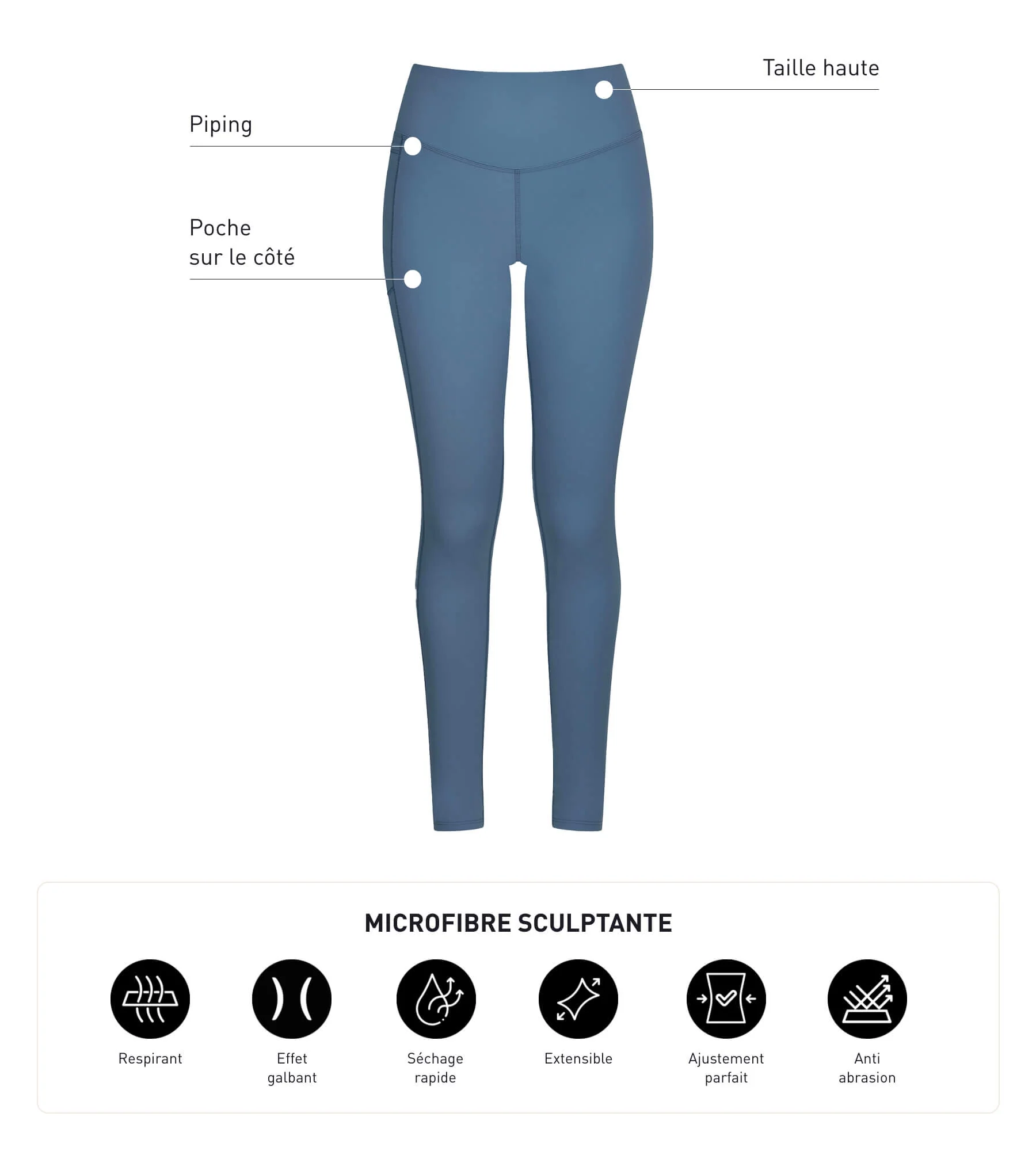 En la versión azul denim, joven y desenfadada, esta prenda aporta un look muy sport-chic. Combina los leggings con otras prendas de arriba del mismo color o complementarios de nuestra colección en microfibra moldeadora Dim Move. ¡Para moverse con garbo!