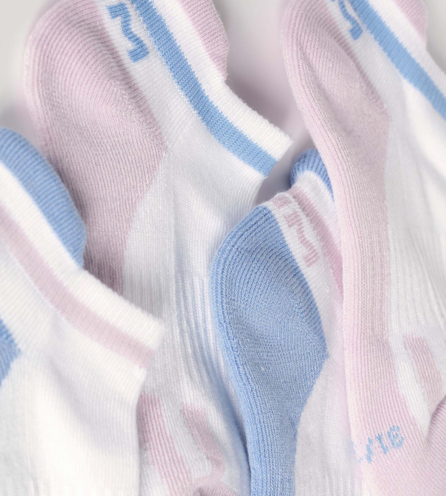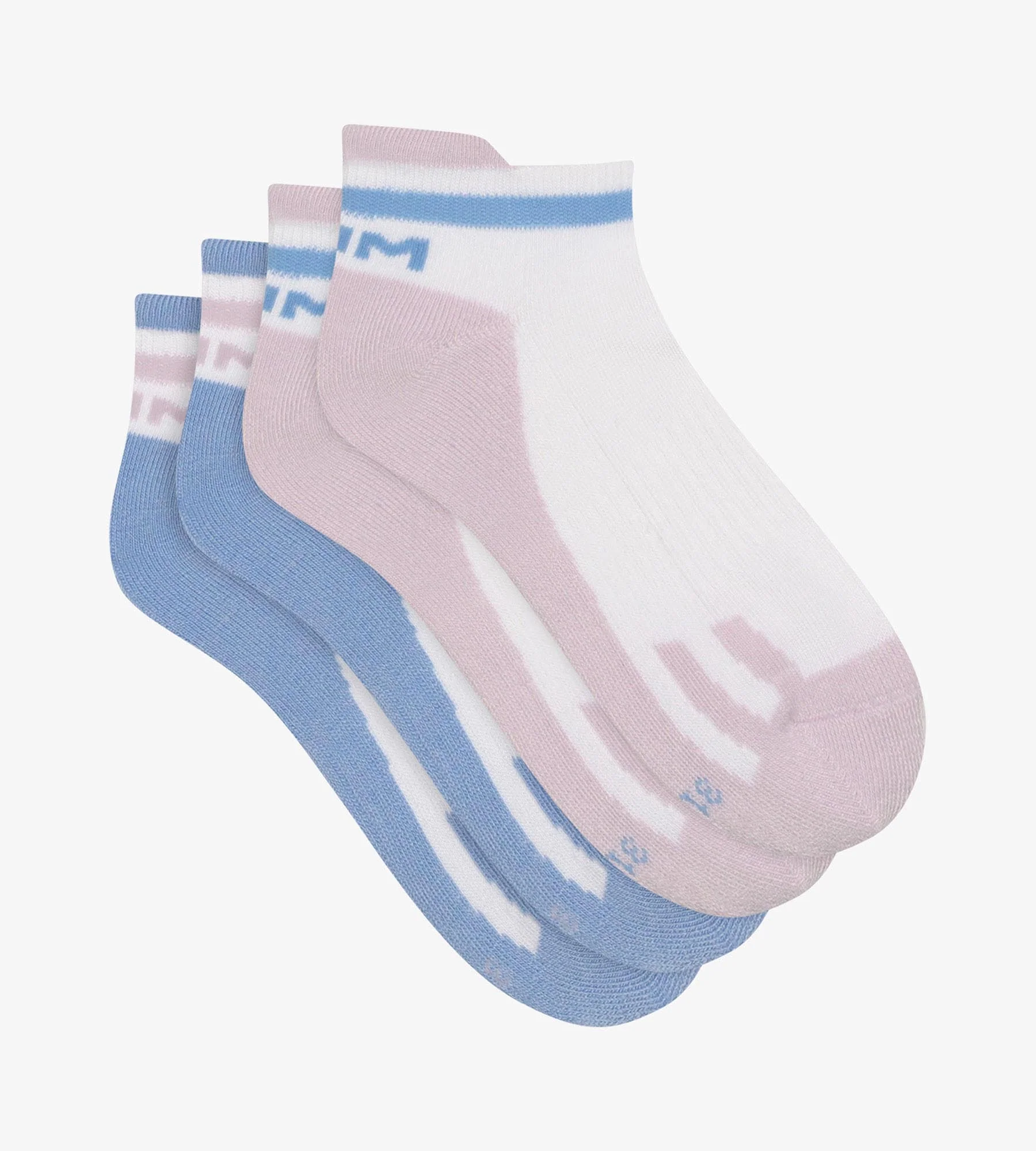 Añade un acabado suave a tu ropa deportiva con este pack de 2 pares de calcetines mixtos antichoque Dim Sport en algodón Blanco, Lila y Azul.