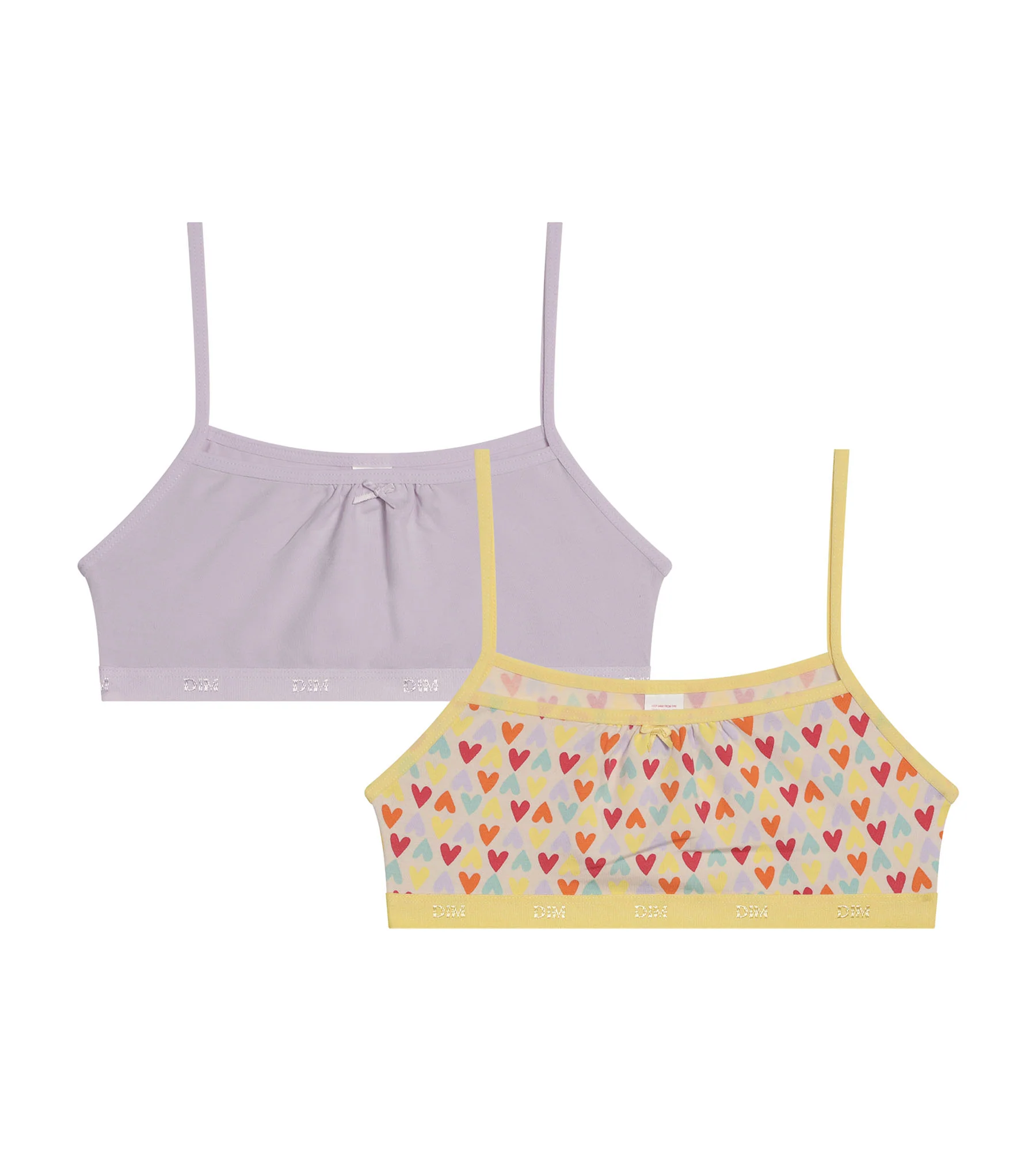 Para un día de confort y dinamismo, descubre el Pack de 2 sujetadores para niña Les Pockets de algodón elástico amarillo y lila con motivo de corazones.