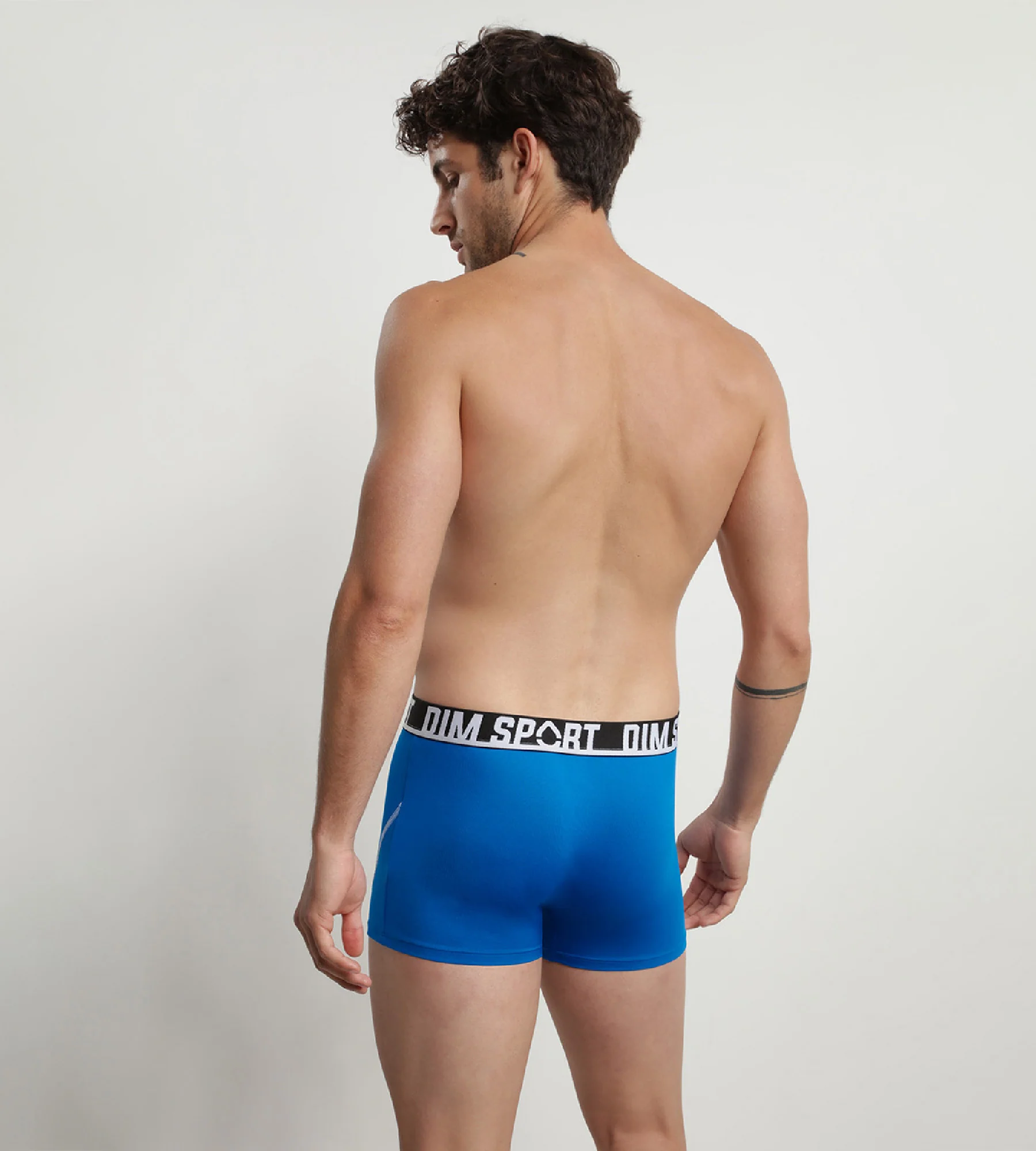 Compuesto por un bóxer negro de hombre sobrio, otro bóxer en Azul Berlín misterioso y bóxer en Azul Cian cautivador, con una cinturilla gráfica con el logo de Dim, tu Pack de Ropa interior de Hombre Dim Sport es potente y eléctrico Te gustará el material termorregulador y la estructura con zonas en mesh de nuestros Bóxers y calzoncillos deportivos: estarás siempre fresco y seco, sin incomodidades