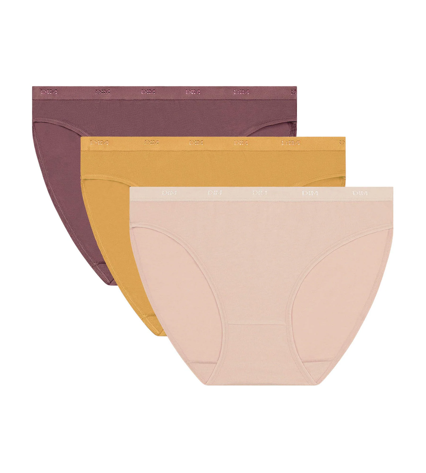 Consigue un look brillante con el Pack de 3 braguitas de algodón elástico para mujer Les Pockets EcoDim en amarillo, rosa y marrón.