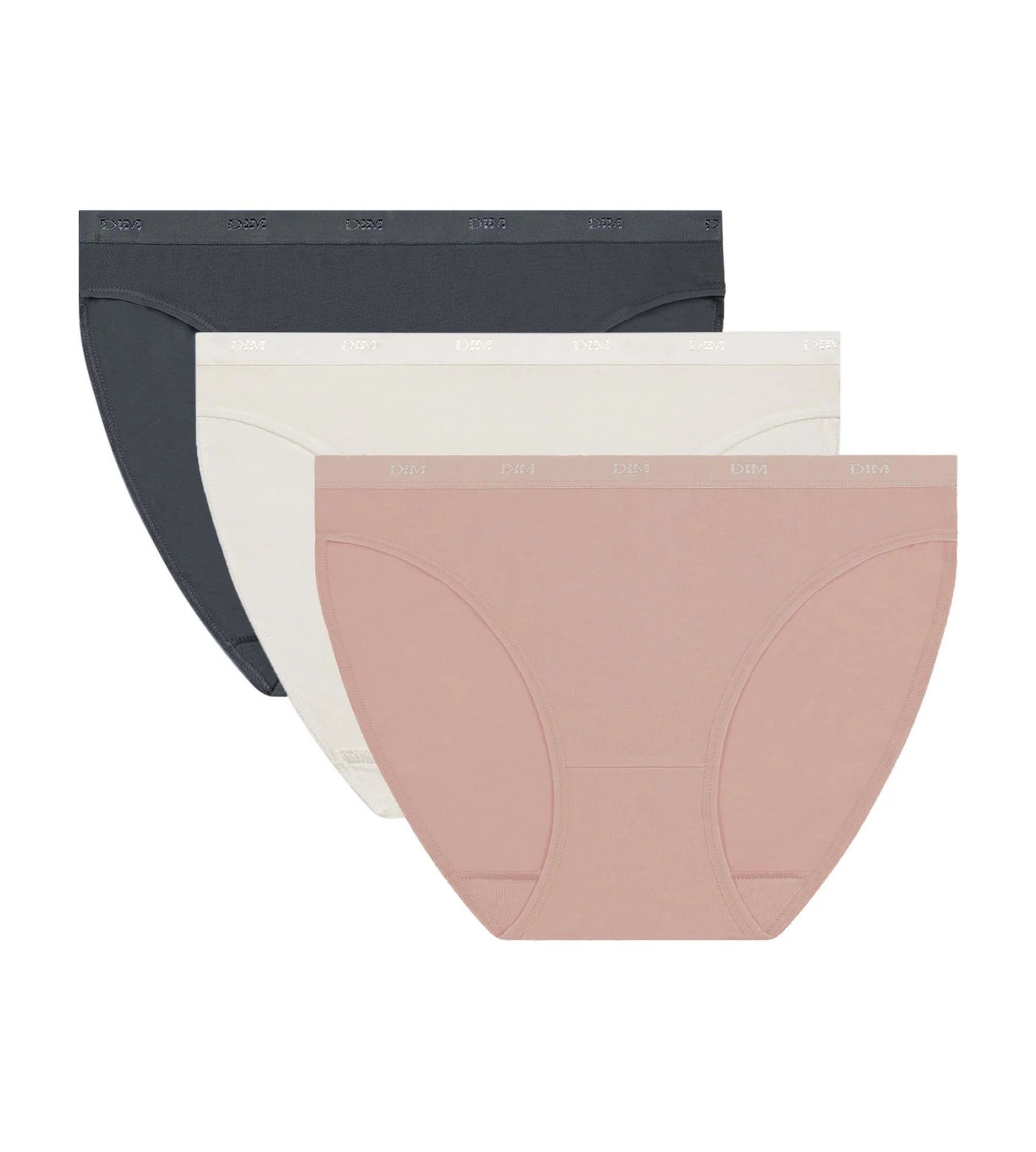 Marca estilo cada día con el conjunto de 3 braguitas Les Pockets EcoDim en algodón elástico gris granito, rosa arcilla y blanco.