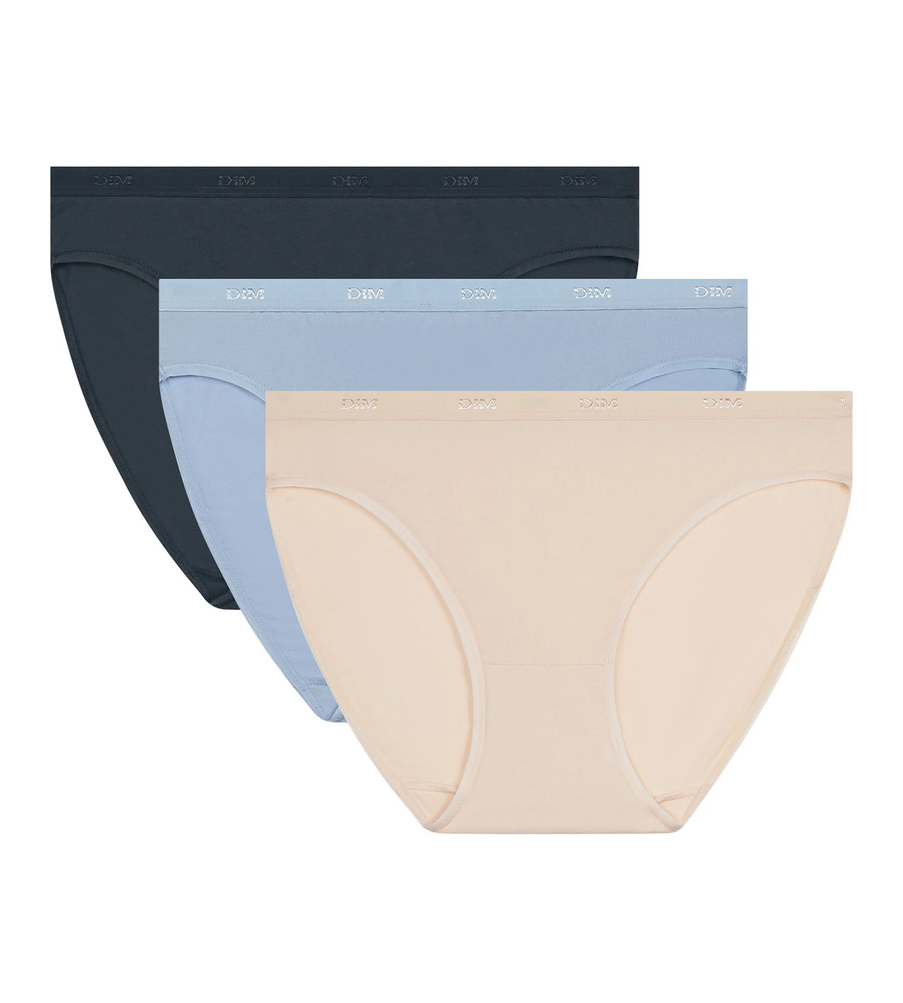 Para una sobriedad y un estilo sin esfuerzo, elige el Pack de 3 bragas de mujer de algodón elástico Les Pockets Ecodim en azul, gris y beige.