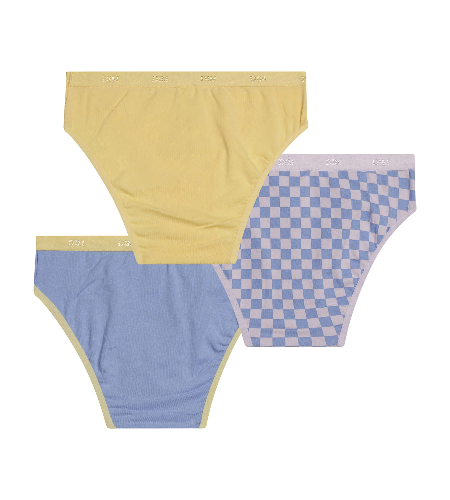 Despierta tu colección de ropa interior con el Pack de 3 braguitas Les Pockets de algodón elástico amarillo y morado con estampado de cuadros.
