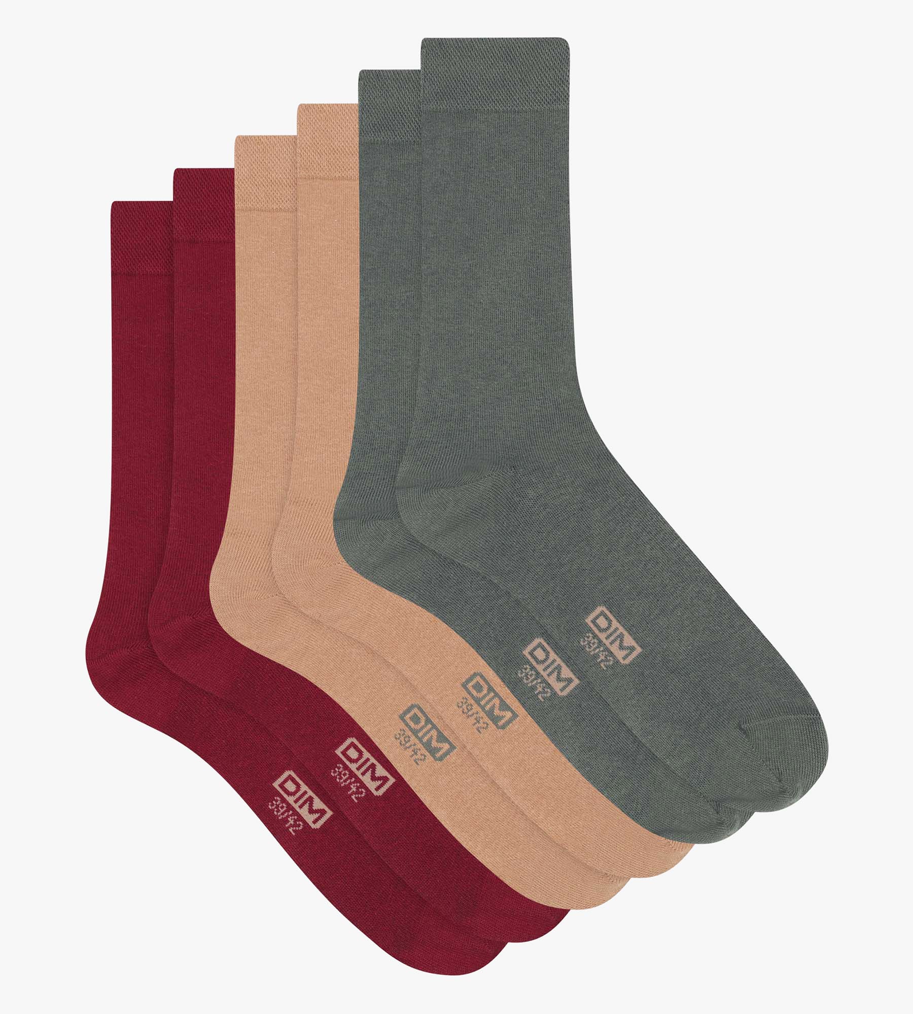 ¡Añade un toque de carácter a tus conjuntos con este Pack de 3 pares de calcetines altos de hombre Dim Coton en Rojo Chili, Praliné y Caqui!