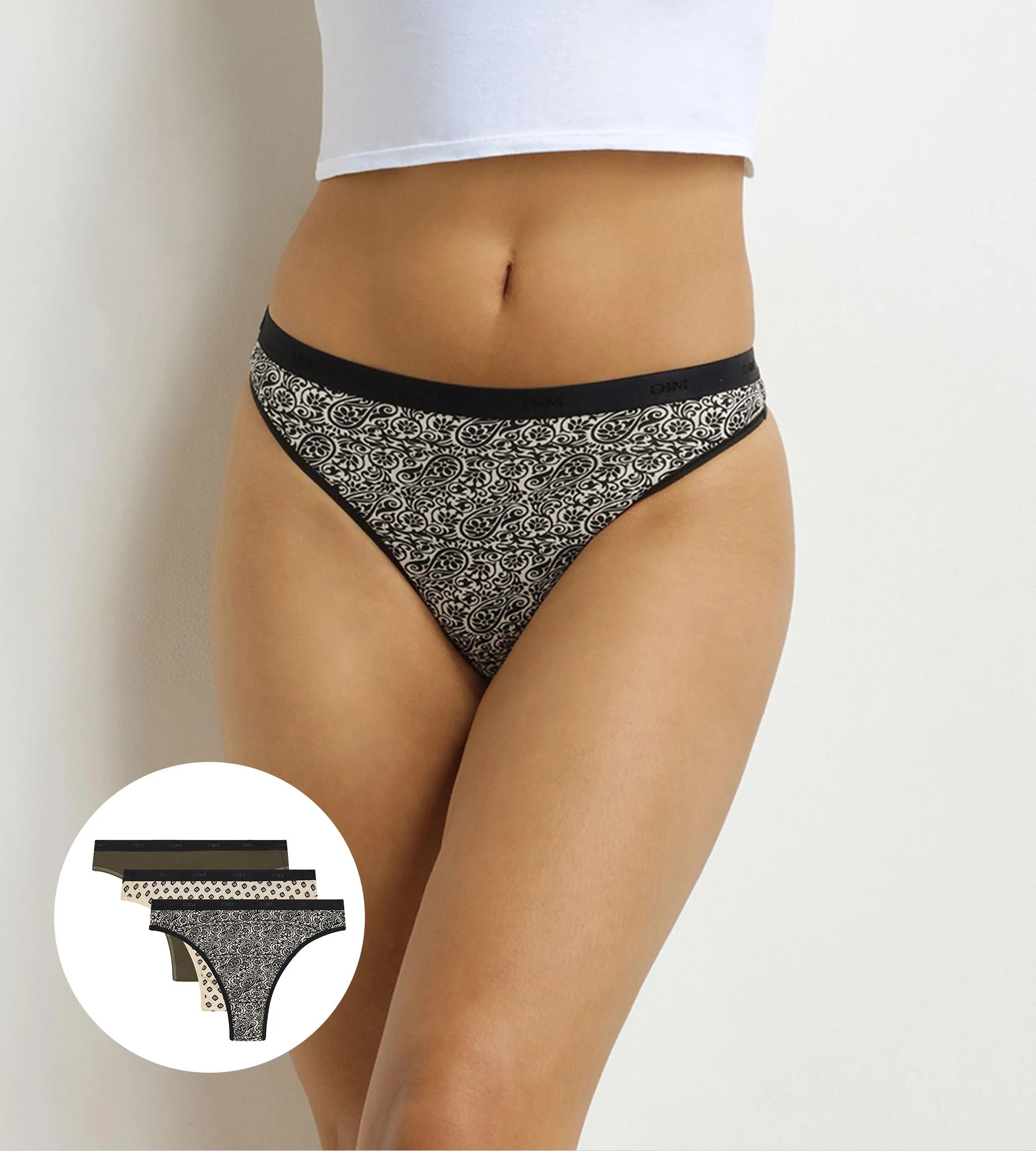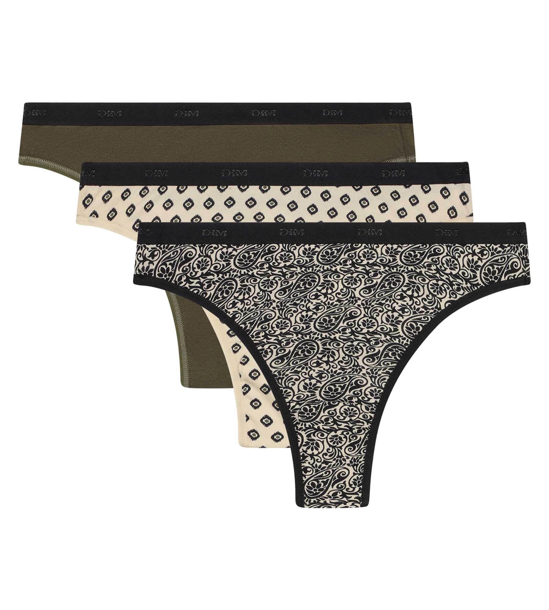 Este pack de 3 tangas para mujer de la gama Dim Les Pockets es perfecto para renovar tus básicos con estilo. Entre el estampado paisley negro, el tanga beige con motivos geométricos negros y el estampado liso caqui, cada pieza aporta su dosis de carácter. Gracias a su corte invisible y su tejido de algodón elástico, estos tangas para mujer se deslizan fácilmente bajo todas tus medias, con facilidad.
