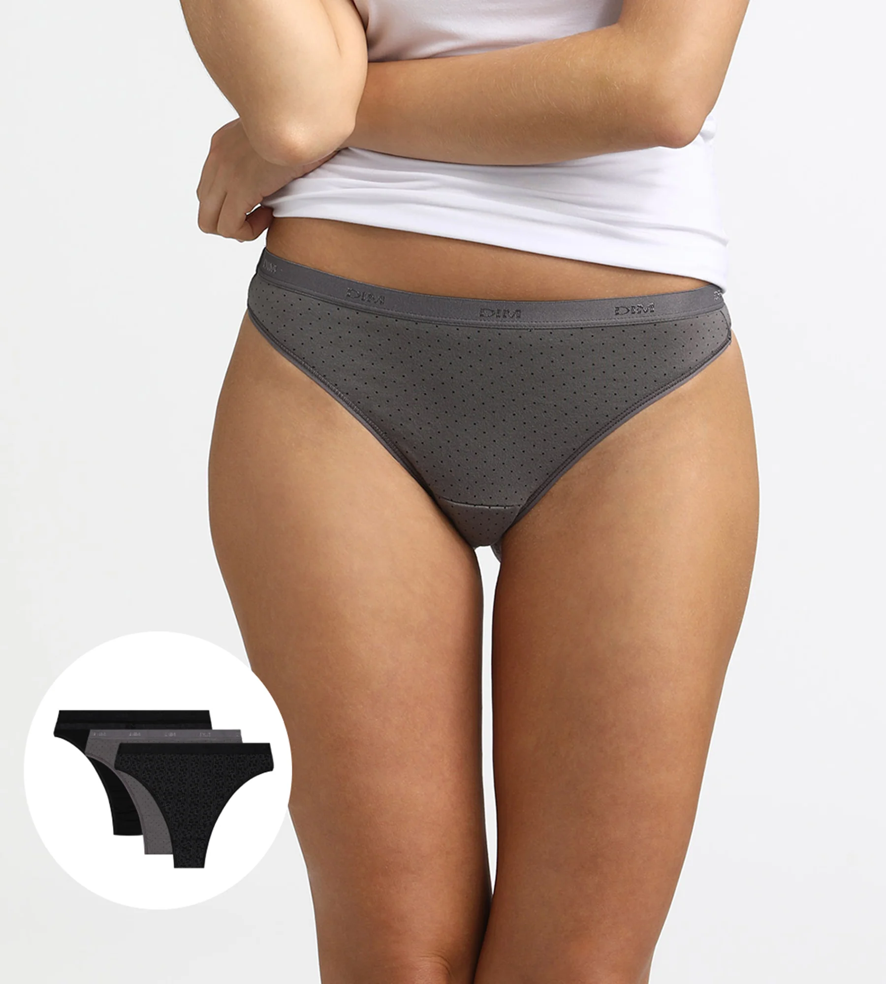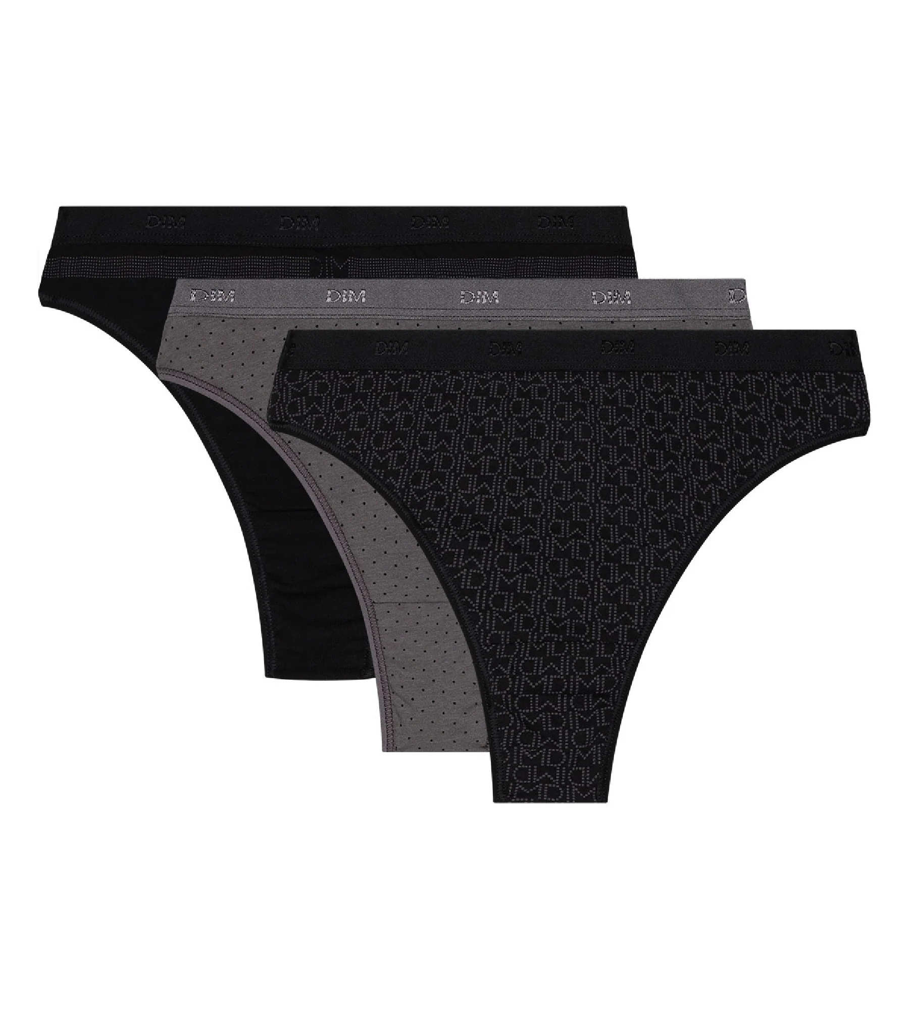 - 1 tanga gris con lunares negros, 1 tanga negro con los logos de DIM en la cintura y 1 tanga negro con estampado de logos DIM.