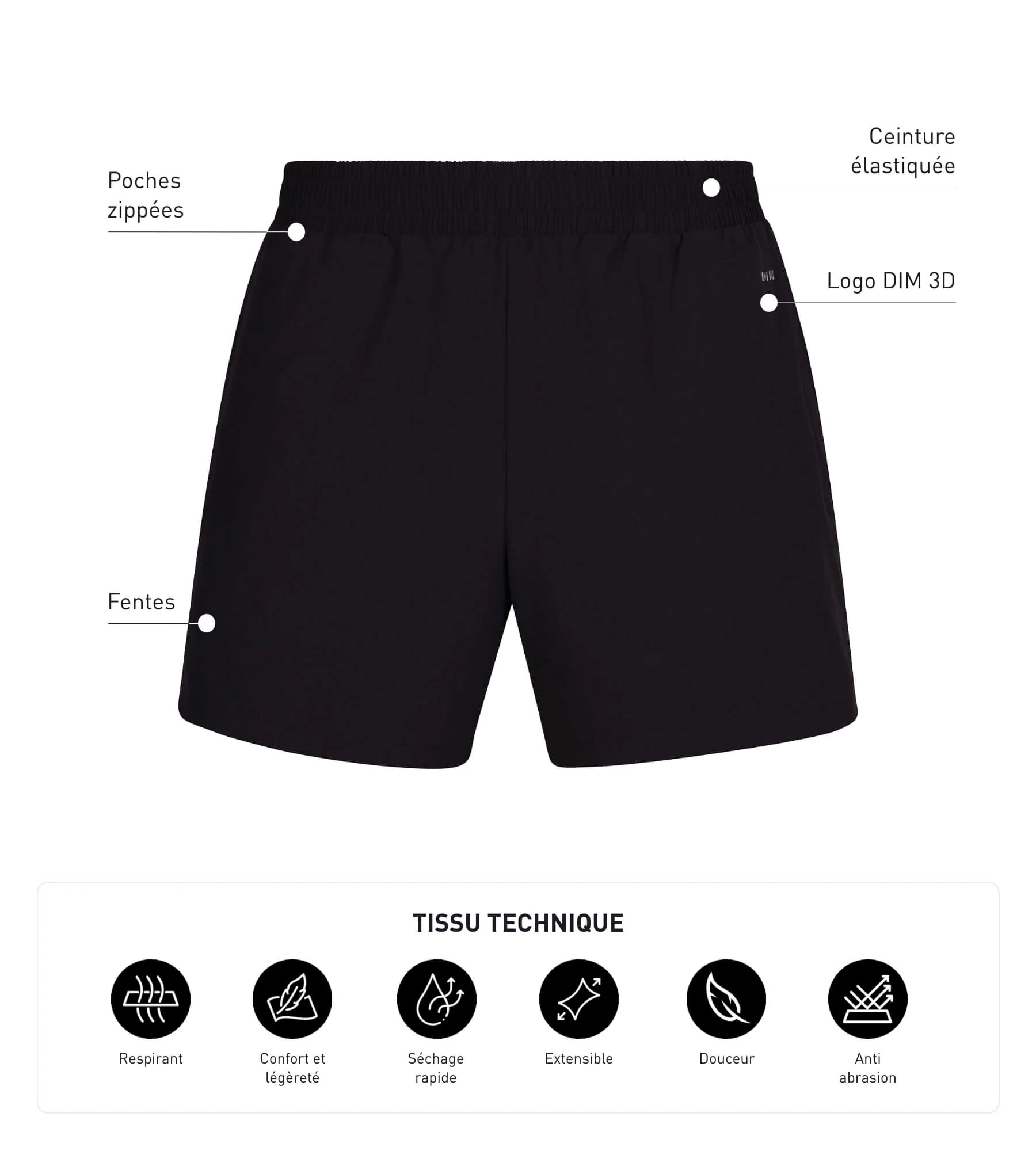 Diseñado para mejorar tus entrenamientos, incluso los más intensos, el pantalón corto deportivo para hombre en tejido vaporoso negro Dim Move es una prenda deportiva funcional que seca el sudor más rápido. Además es cómoda, por su fluidez, apenas lo sentirás.