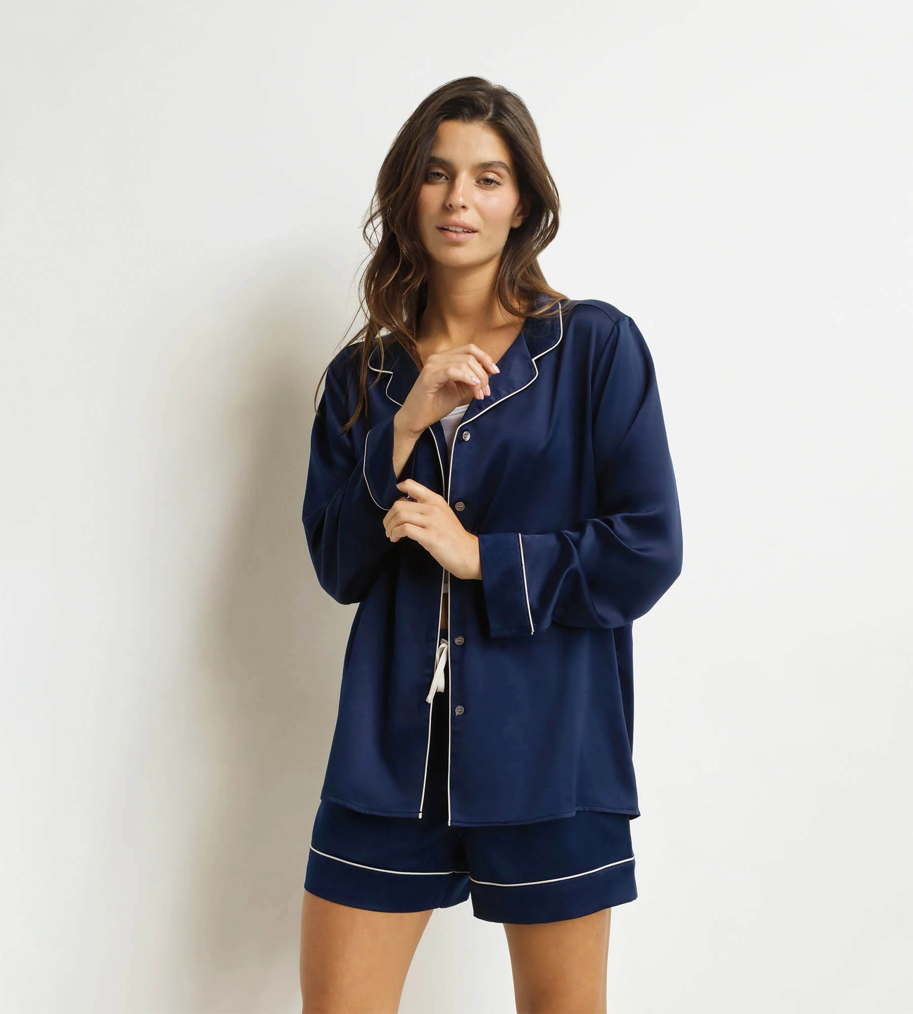 Ligero y refinado, opta por el pijama corto de satén azul medianoche para mujer Dim Don’t Disturb, para noches de rêve!