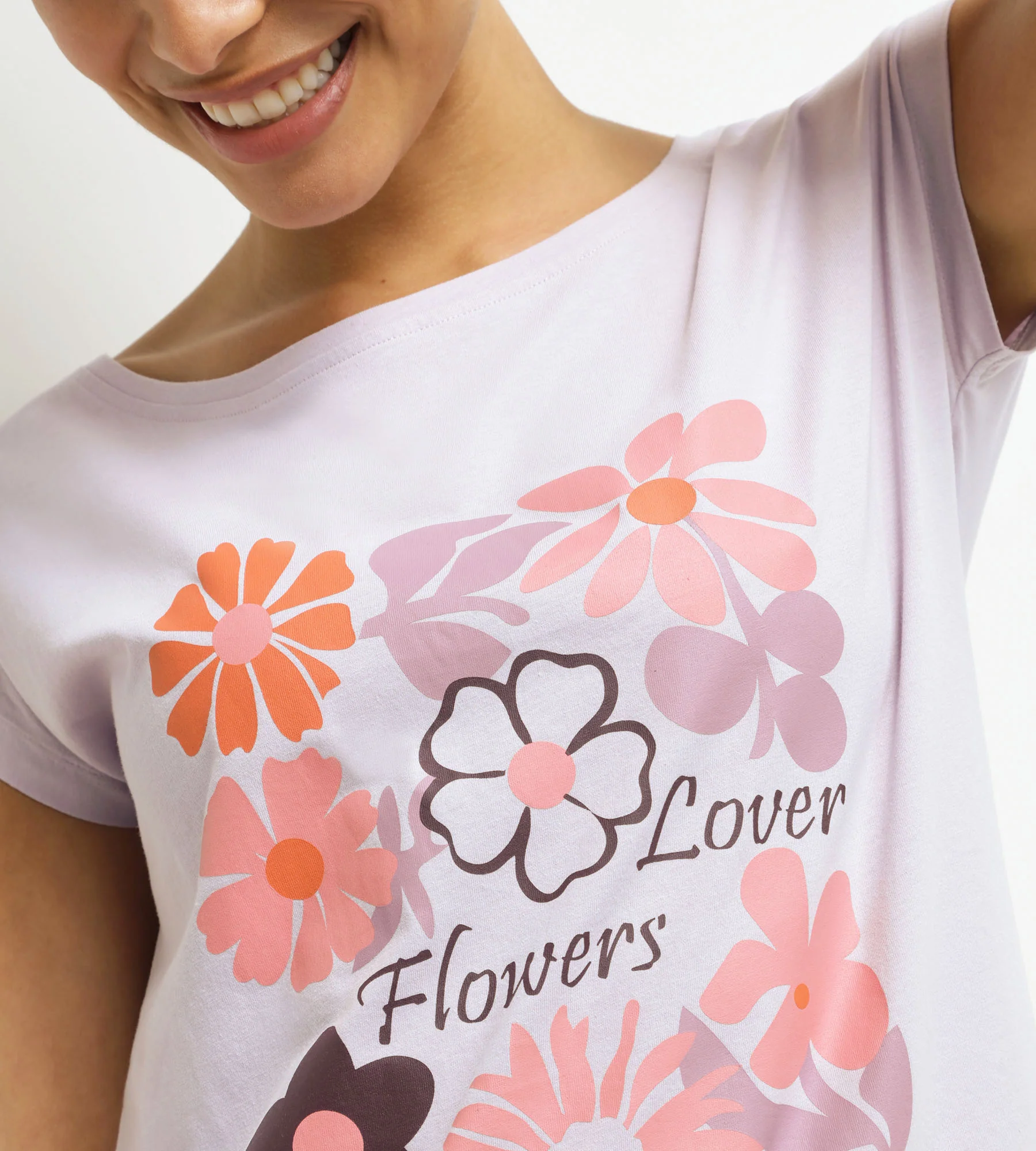 Sumérgete en la suavidad con el camisón para mujer Dim Nightwear en ligero jersey lila y un colorido estampado floral.
