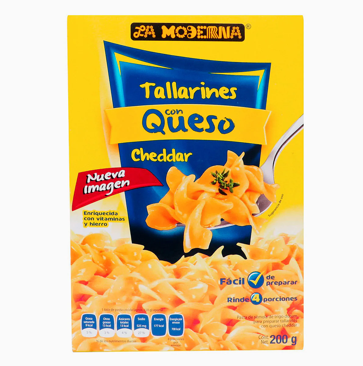 Sopa, La Moderna. Tallarines. Con Queso Cheddar. De 200 Gramos. ¡Todo Comienza Con La Moderna!, Elaborada Con Sémola De Trigo Durum. Enriquecida Con Vitaminas Y Hierro.