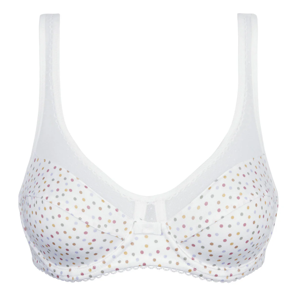 Te encantará nuestro sujetador de gran capacidad Generous en algodón bio Blanco cubierto por una nube de lunares, un diseño muy cómodo y un look que te llevará al pasado.