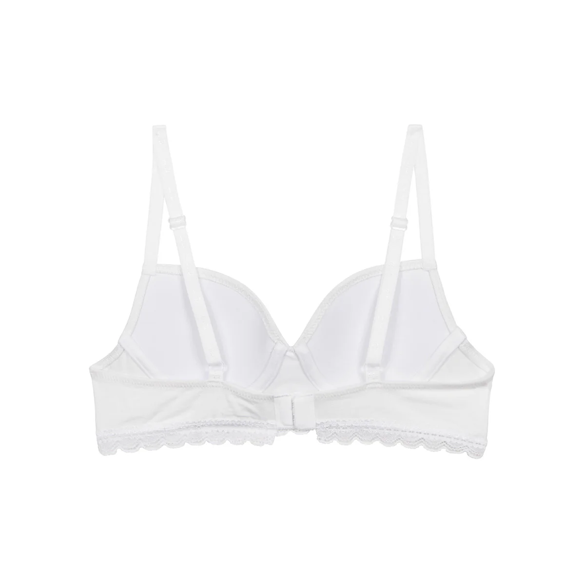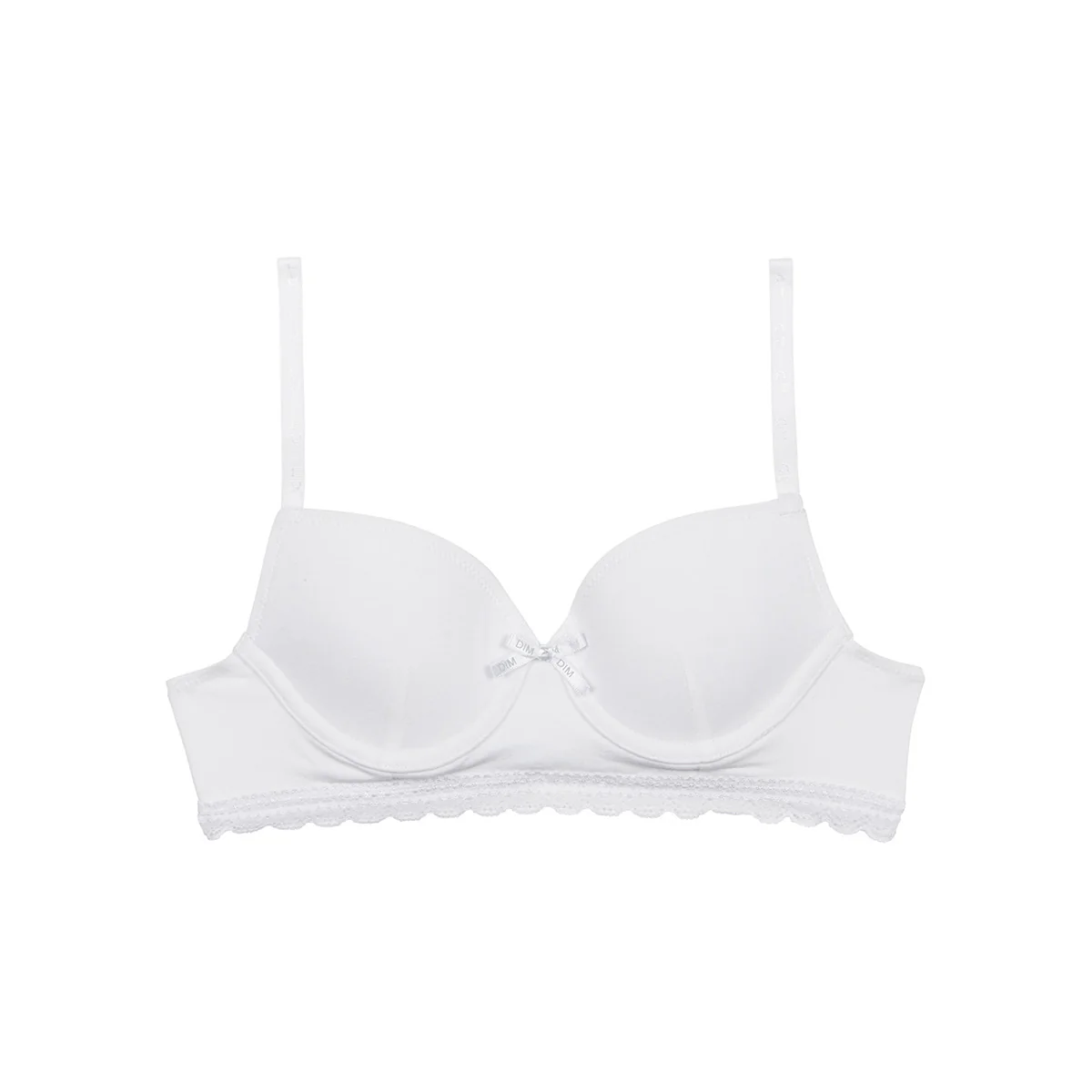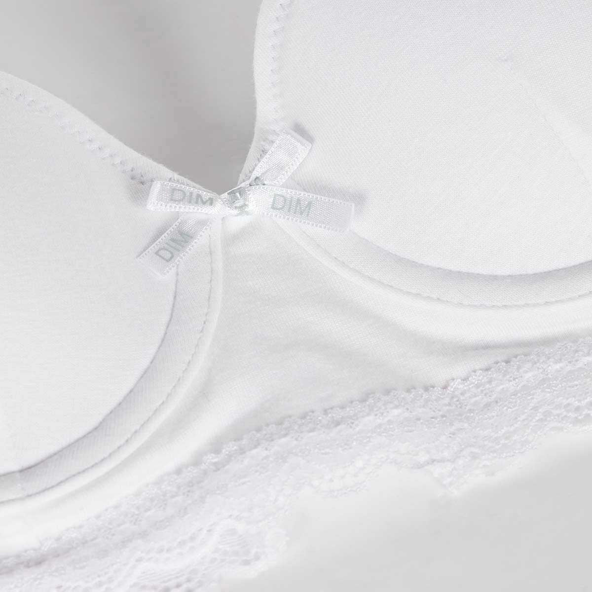 Imprescindible en la lencería femenina, el sujetador blanco de algodón elástico con copas moldeadas de Dim Trendy se viste con un delicado encaje para realzar los pechos de las adolescentes.
