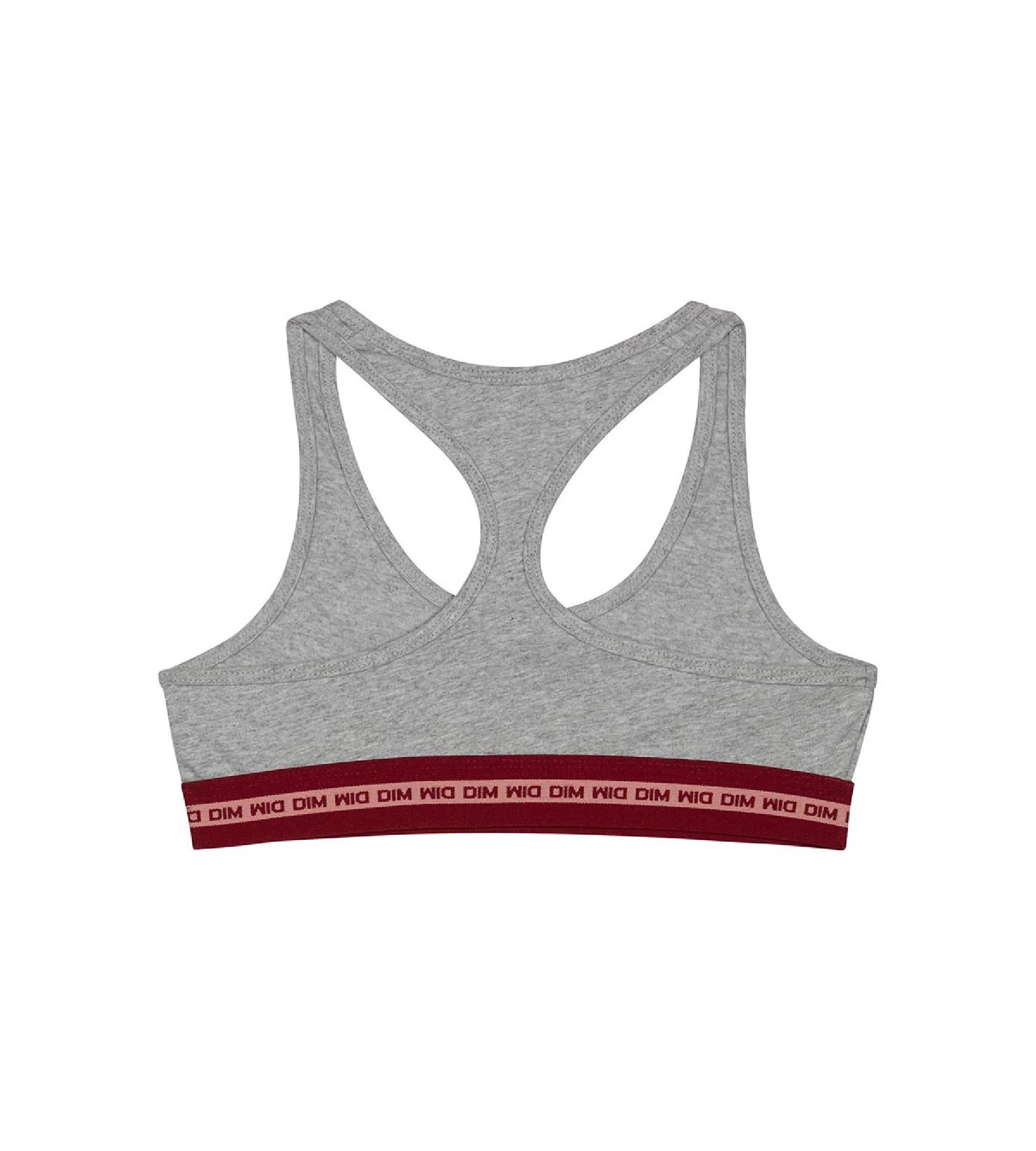 Con su look atlético y casual, el sujetador de niña de algodón stretch Dim Sport Gris Chiné Burdeos y logo brillante combina rendimiento y coquetería