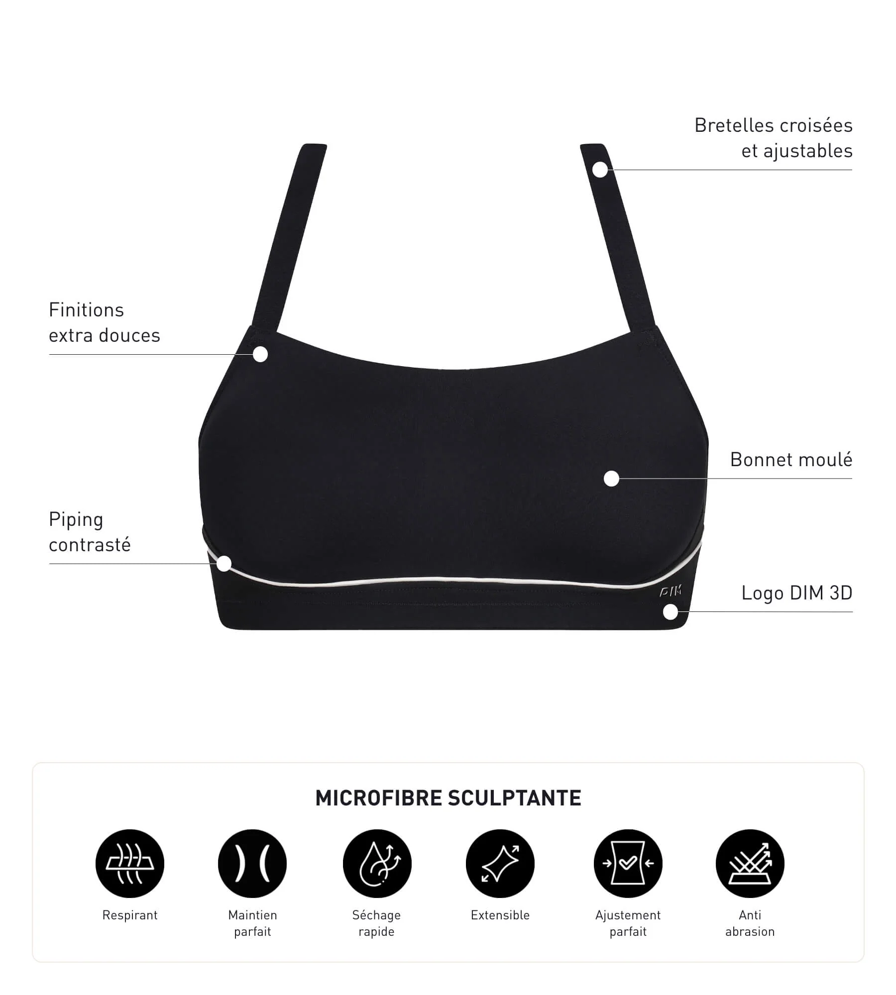 Construido sin costuras, el sujetador deportivo de microfibra moldeadora negro Dim Move se seca rápidamente y, gracias a sus finas copas de espuma, sostiene bien tu pecho para que te entregues al ejercicio que más te guste practicar. Lleva tirantes ajustables y un cierre tipo clip en la espalda, es un sujetador deportivo muy fácil de poner y quitar.