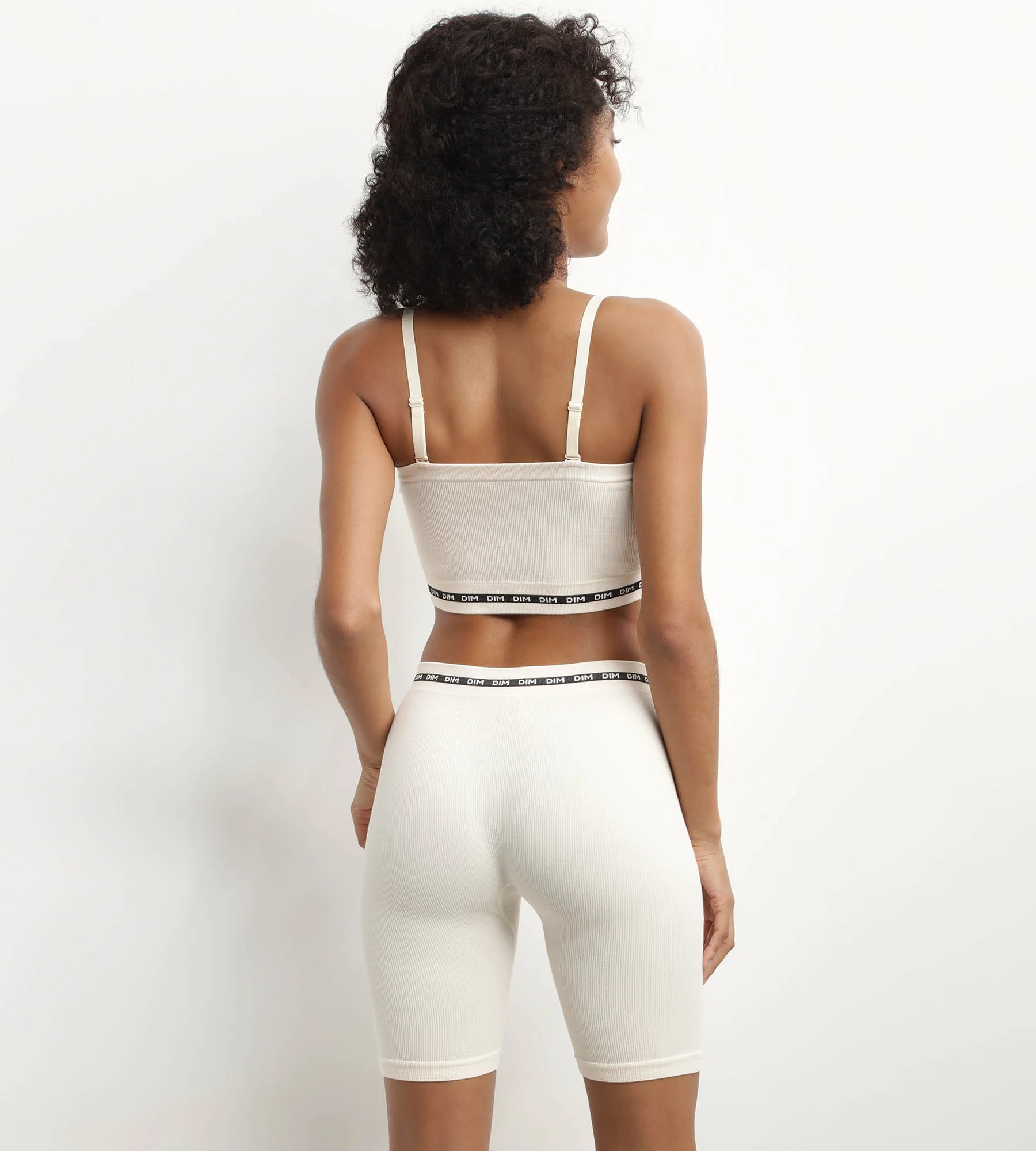 - El contraste del color marfil con la cinturilla elástica con el logo de Dim.