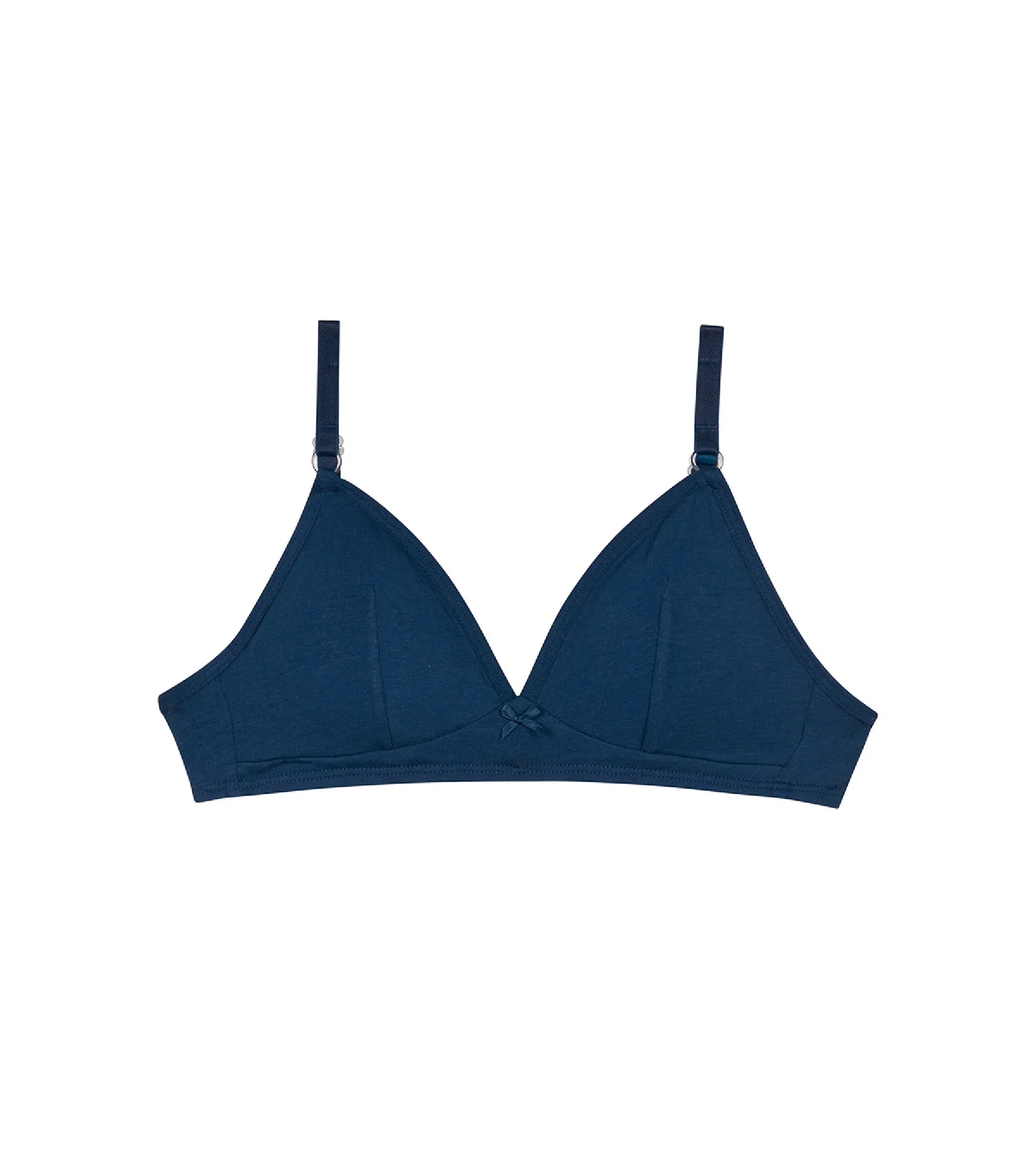 Tu hija se enamorará de este sujetador de niña triangular sin aros Dim Skin Care en algodón bio Azul Marino, de diseño depurado, ajustable y femenino.