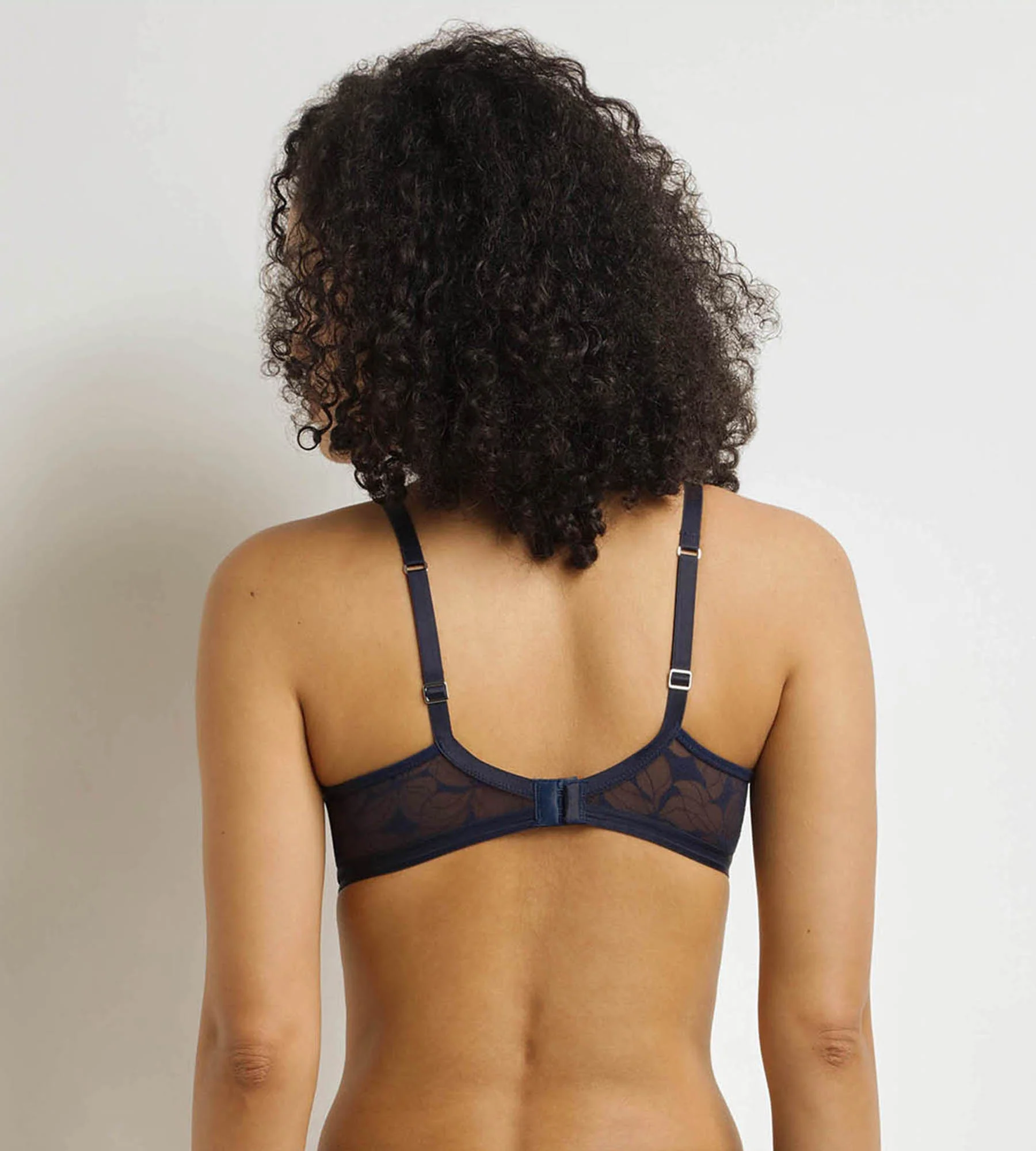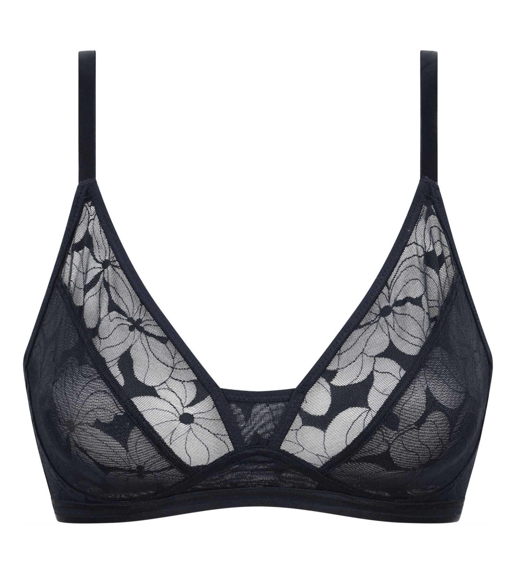 Sujeción natural y estilo romántico con el sujetador de triángulo sin aros Dim Bloom Formal Blue de encaje floral.