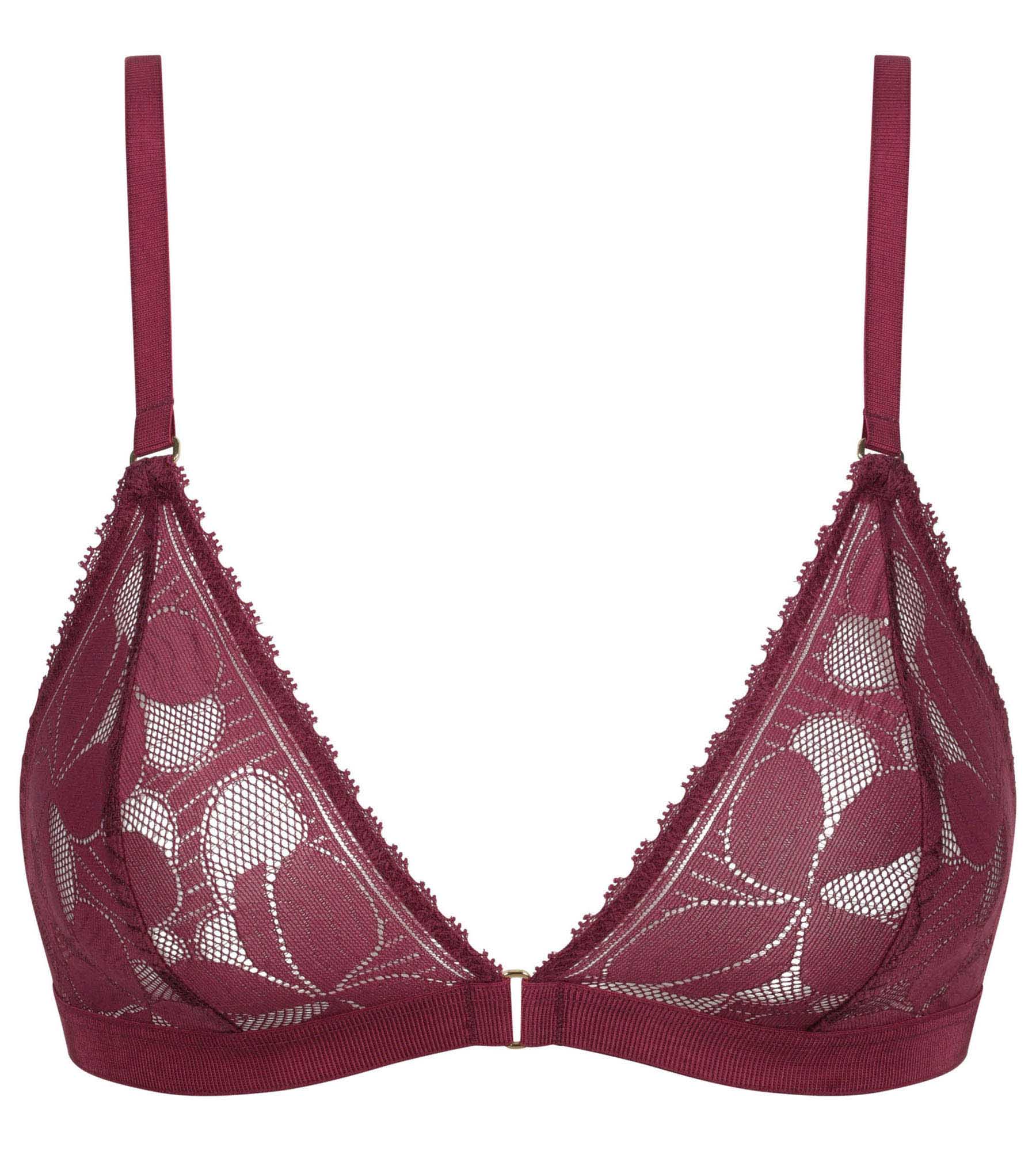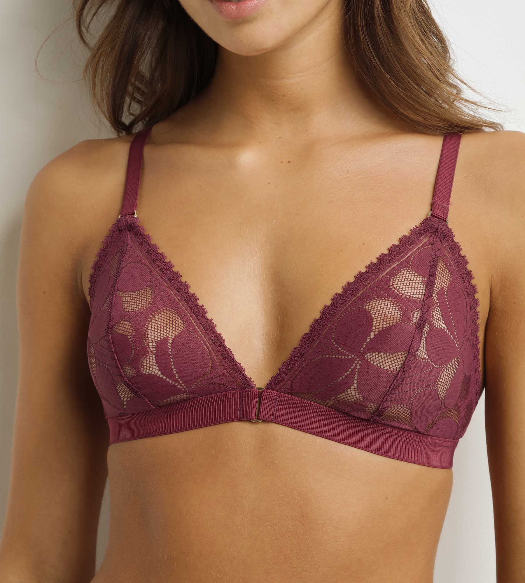 Ligero y sofisticado, enamórate del sujetador triángulo sin aros de encaje Art Flower de Dim en un intenso color Fig.