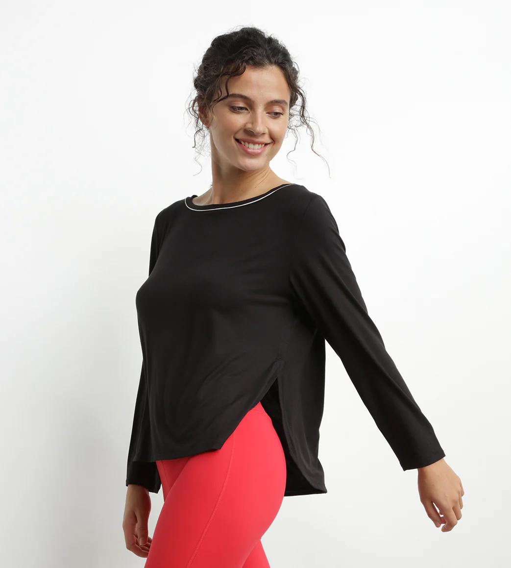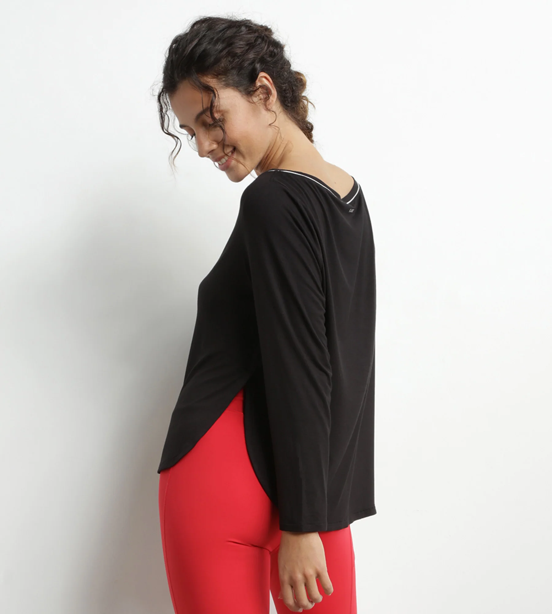 Déjate seducir por el top deportivo para mujer Dim Move de viscosa negra, con un corte holgado para el máximo confort durante el ejercicio.