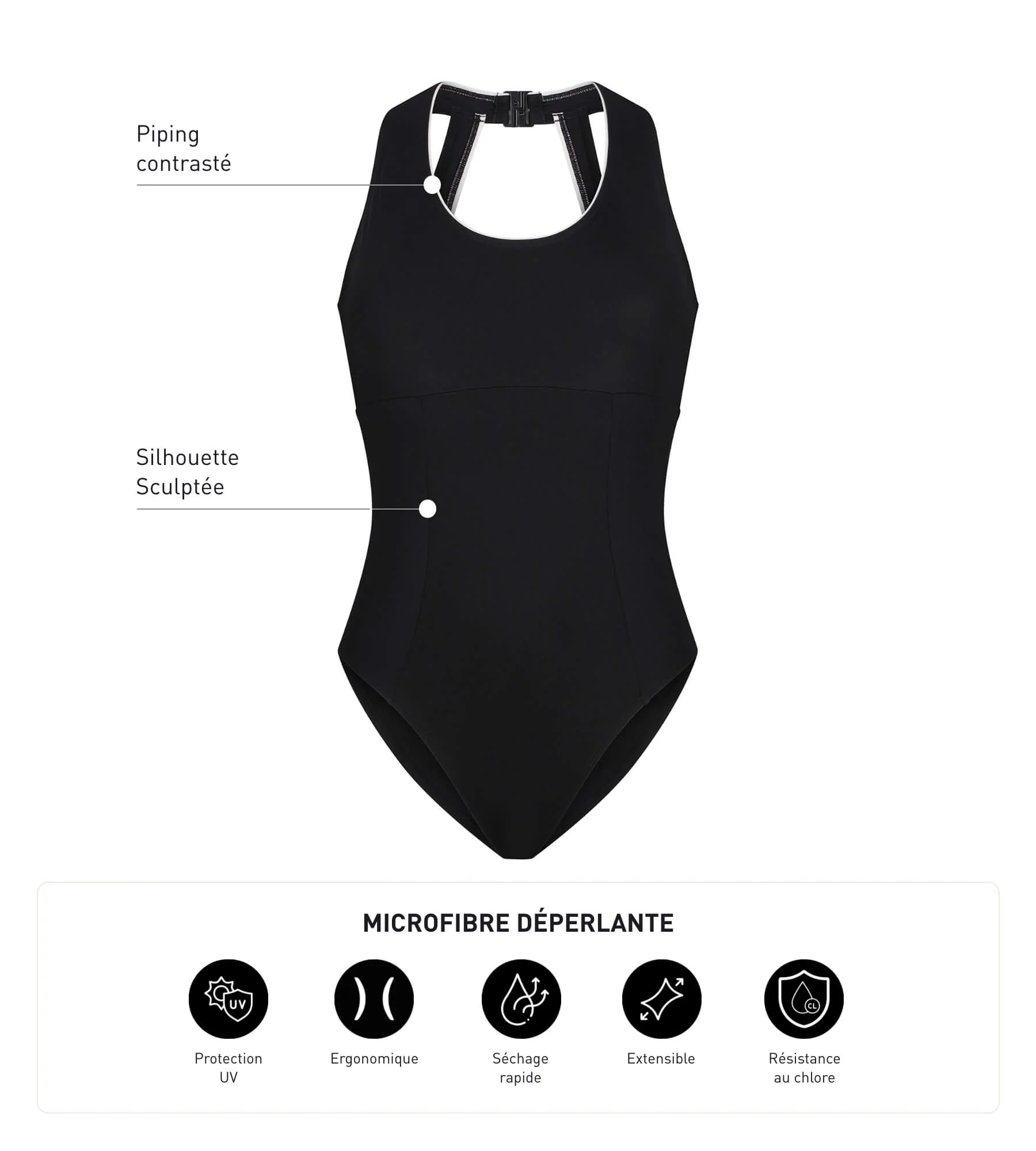 Este bañador de mujer lleva costuras estructuradas y un ribete blanco en el escote que le da un toque más elegante. Deja la espalda bastante abierto y los tirantes se cruzan en la zona del cuello, con un cierre práctico y cómodo de usar. ¡No tendrás que retorcerte para colocártelo!